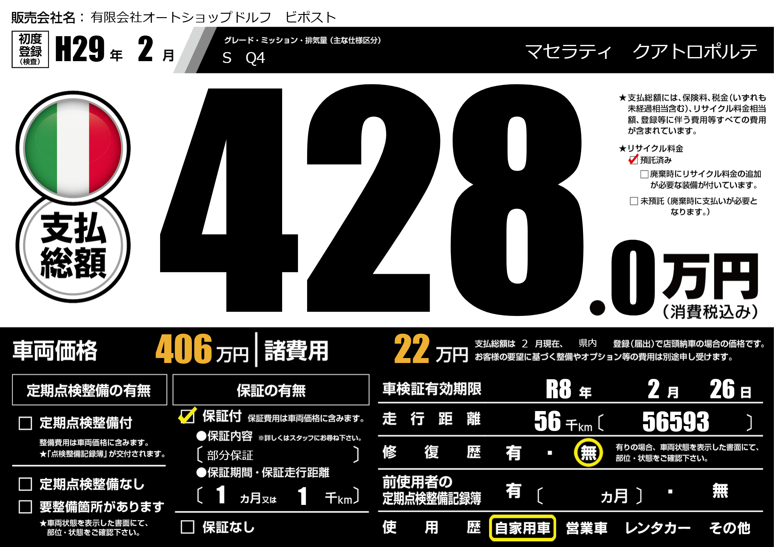 | 車名 | マセラティ クアトロポルテ | グレード ミッション 排気量 |