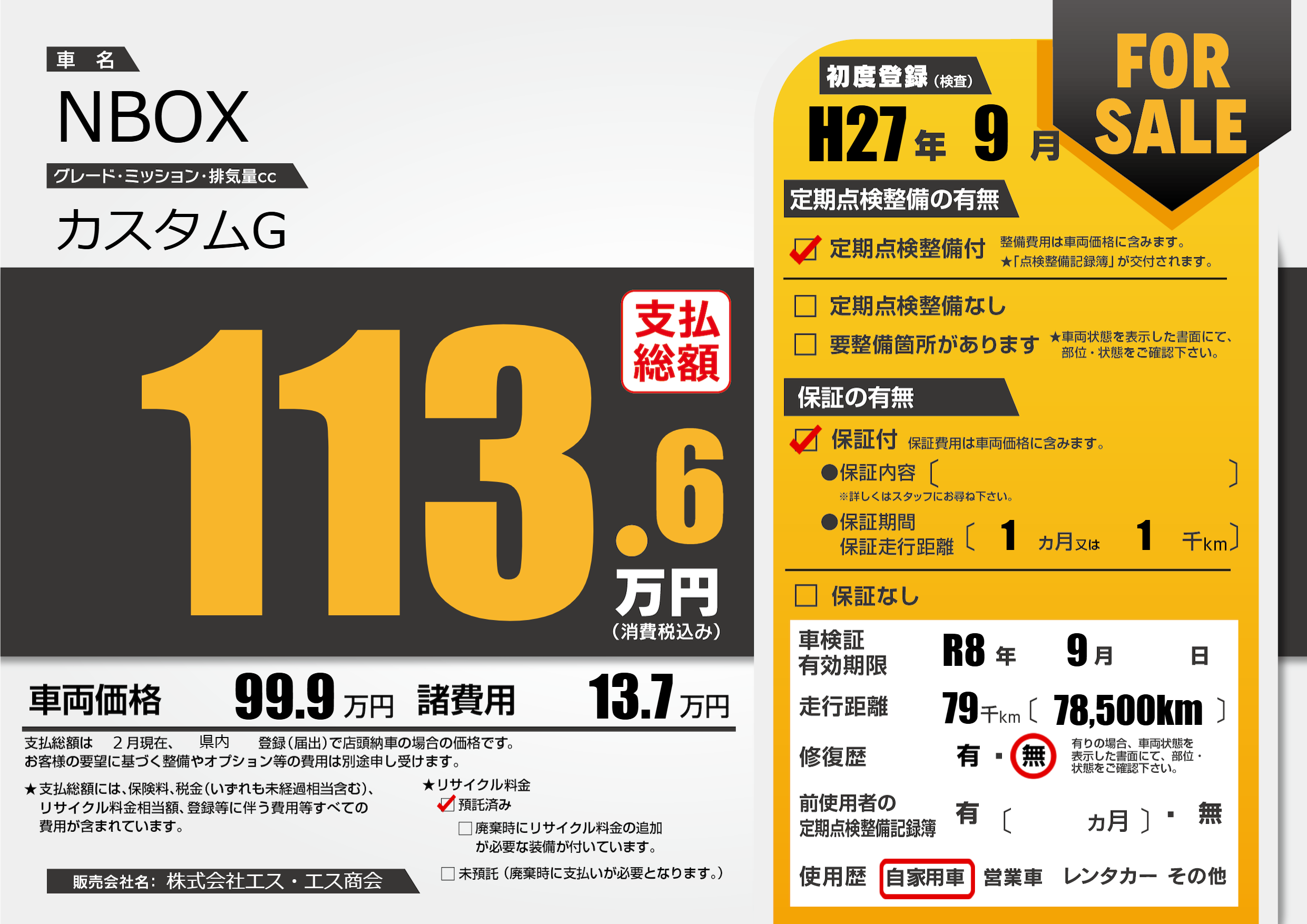 | 走行キロ | 7.9万km | 初年度登録 | H27年9月 |
