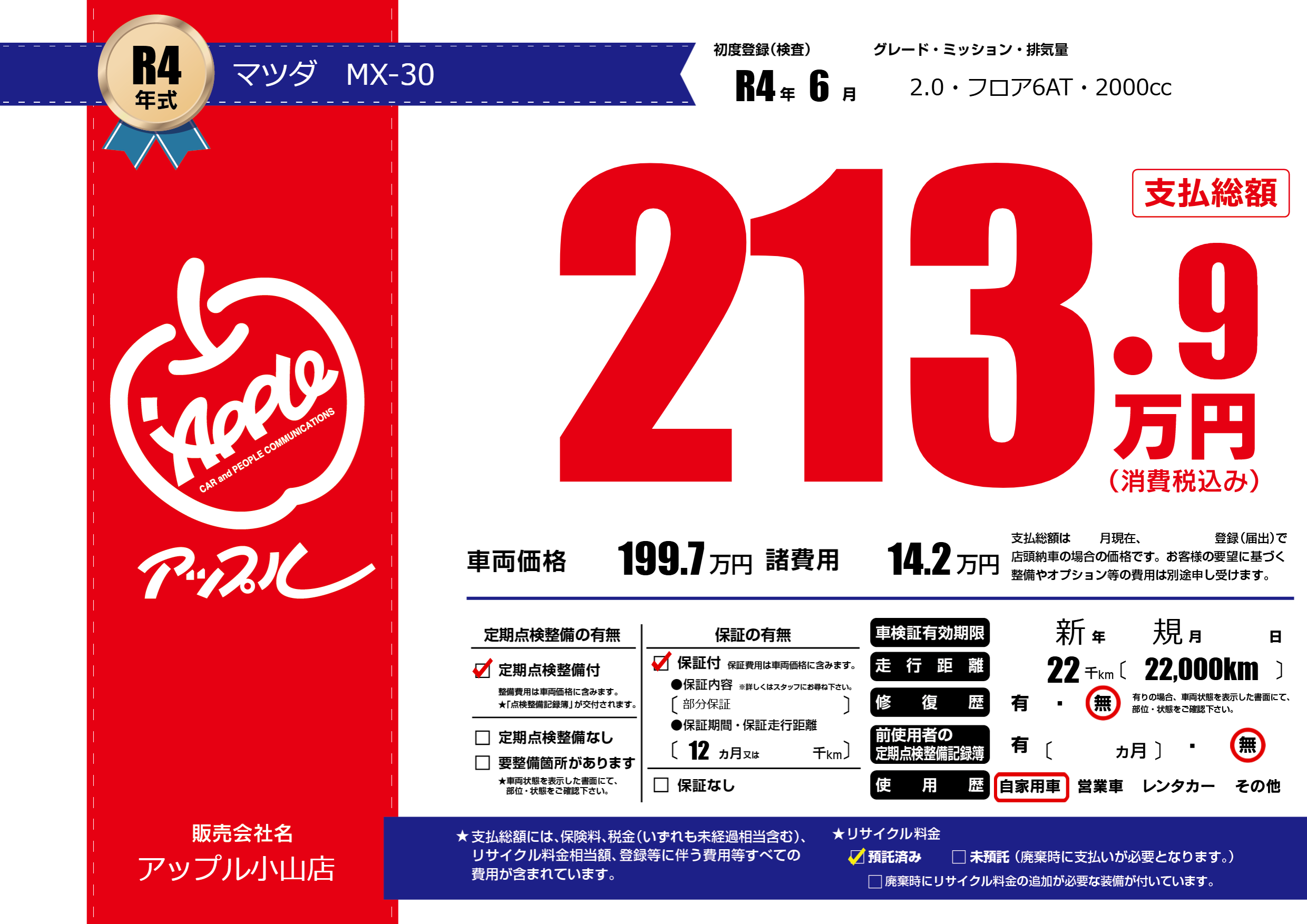 | 車名 | マツダ MX-30 | グレード ミッション 排気量 |