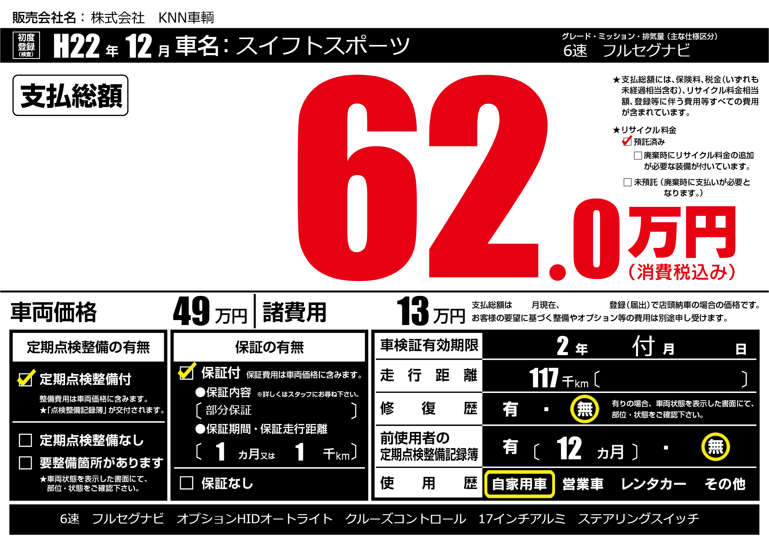 | 走行キロ | 11.7万km | 初年度登録 | H22年12月 |