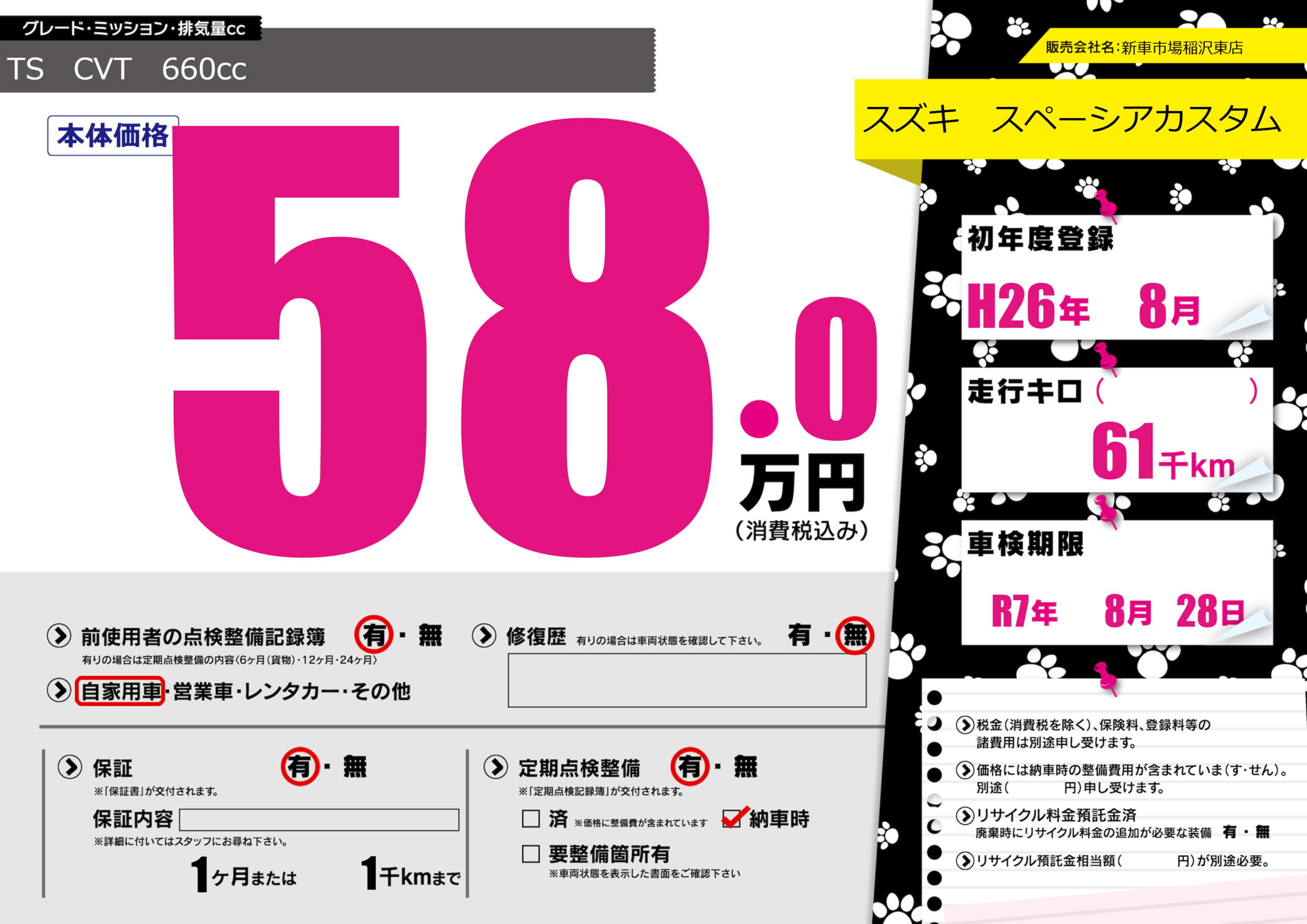 | 走行キロ | 6.1万km | 初年度登録 | H26年8月 |
