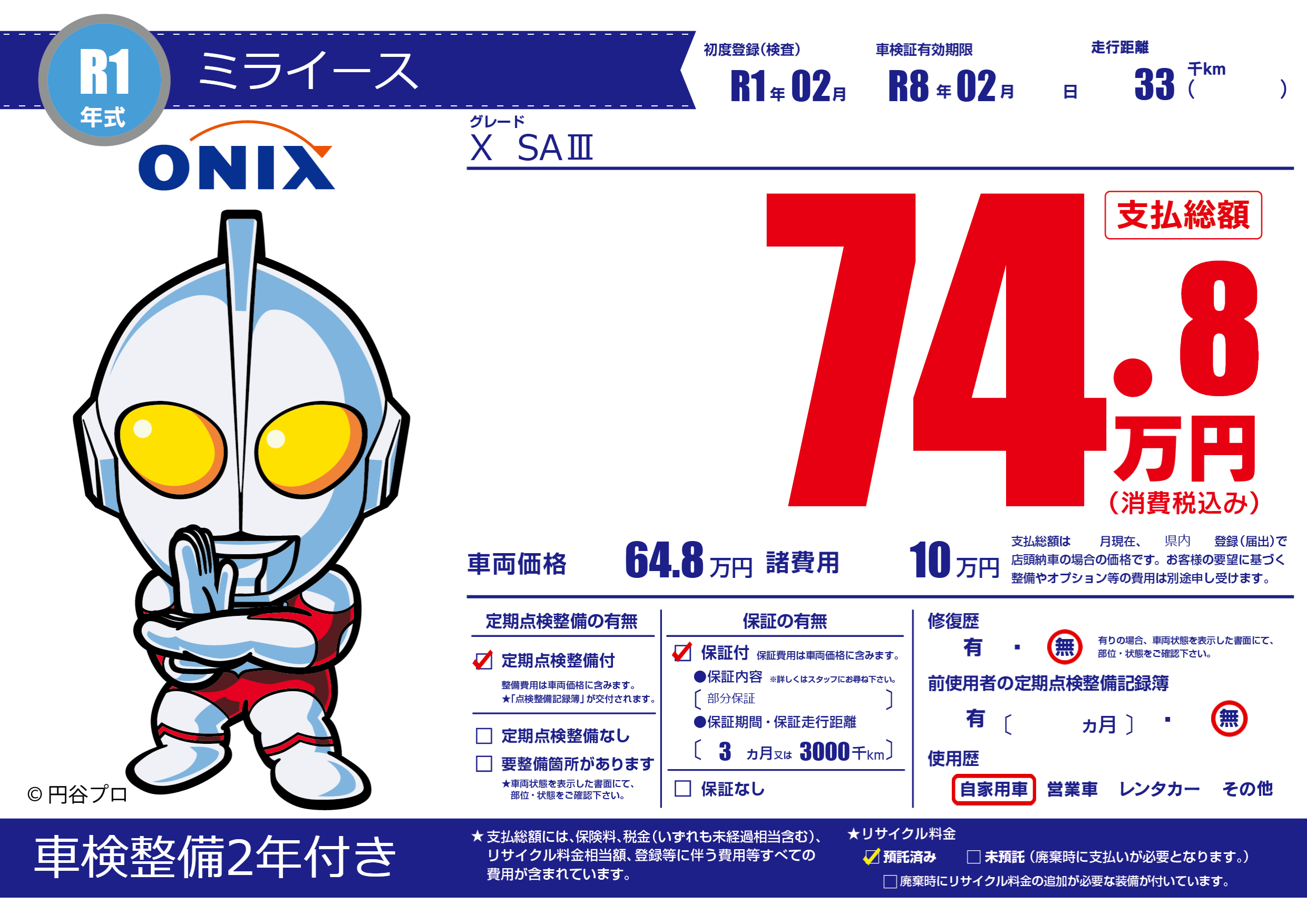 | 走行キロ | 3.3万km | 初年度登録 | R1年02月 |