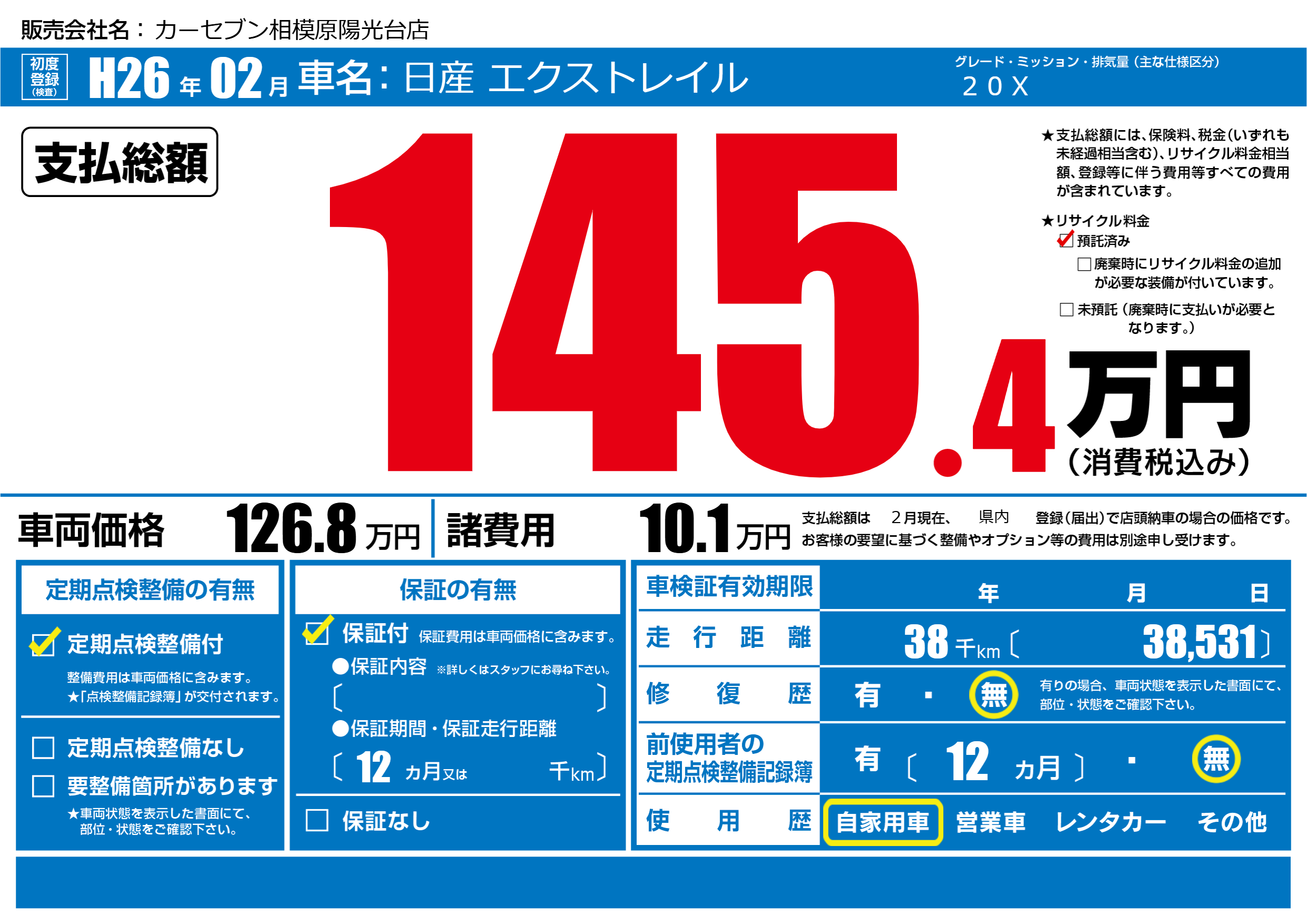 | 走行キロ | 3.8万km | 初年度登録 | H26年02月 |