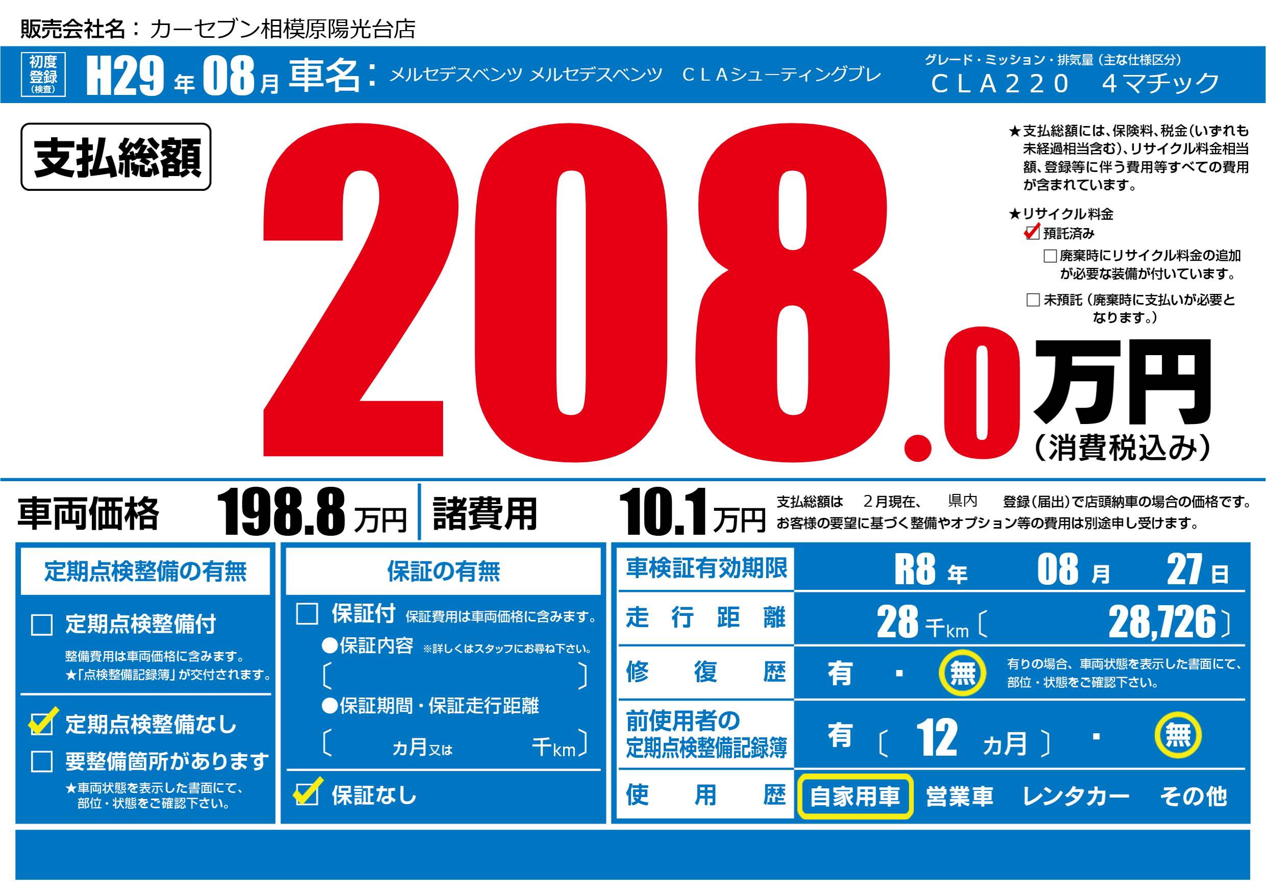| 車検制限 | R8年 08月 27日 | ||