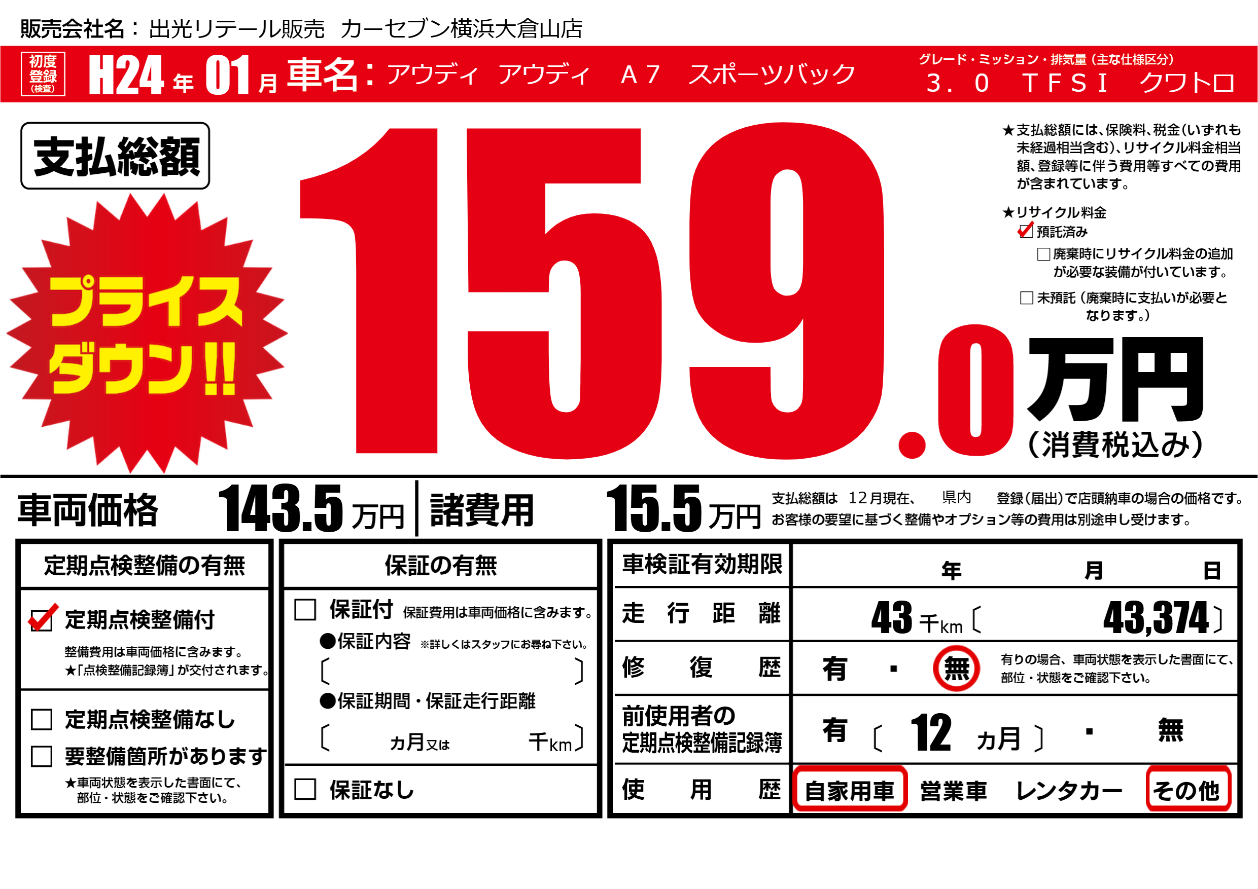 | 車名 | アウディ アウディ A7 スポーツバック | グレード ミッション 排気量 |