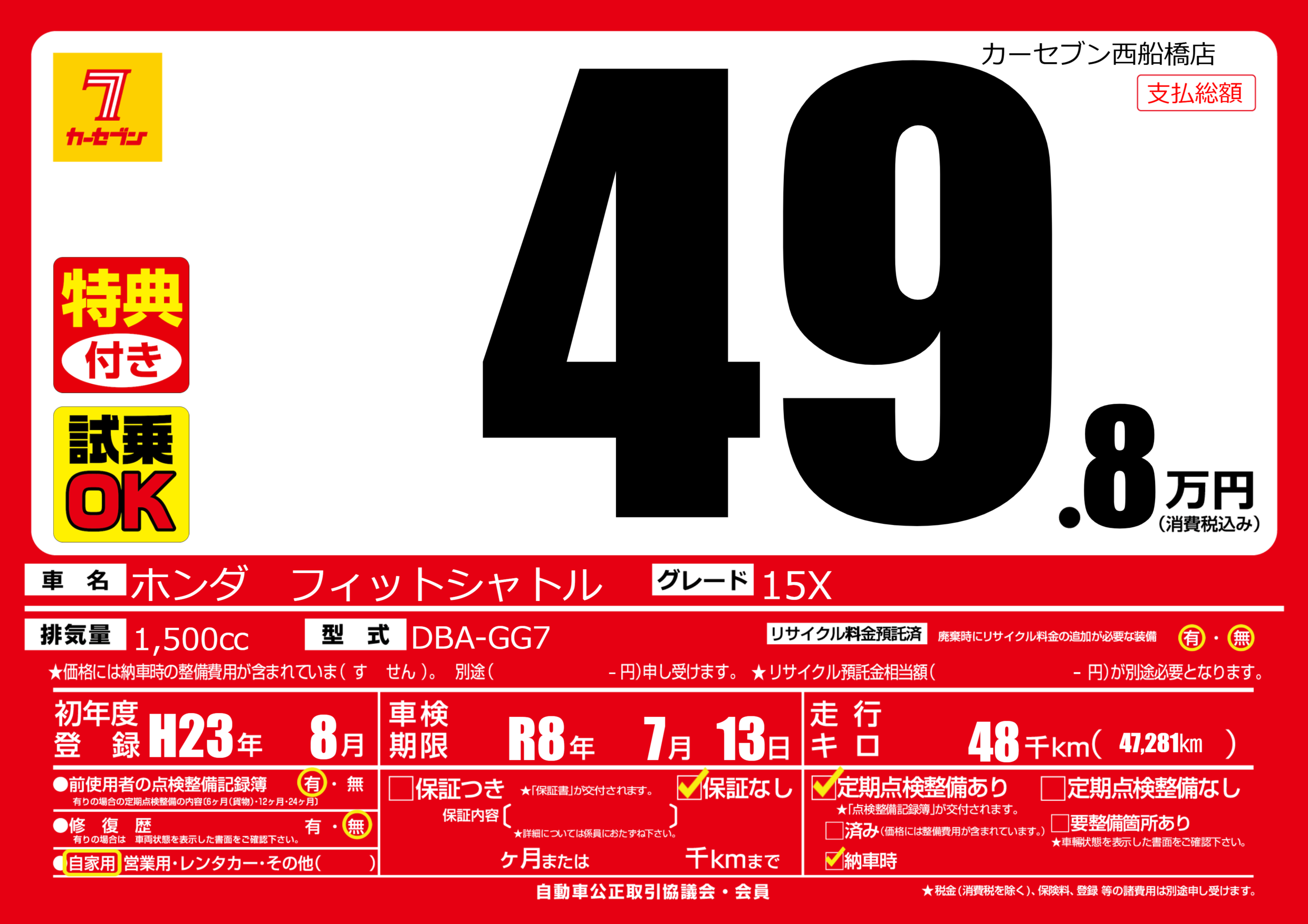 | 走行キロ | 4.8万km | 初年度登録 | H23年8月 |