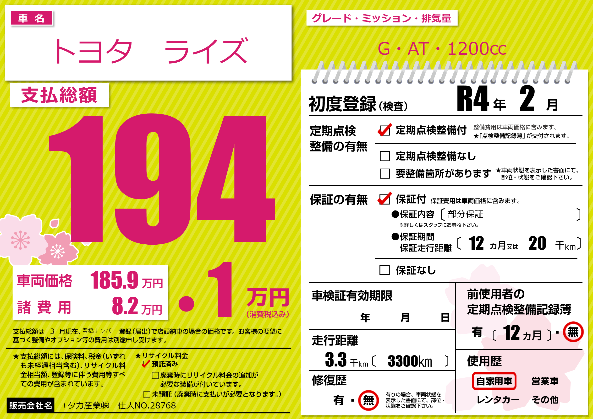| 車名 | トヨタ ライズ | グレード ミッション 排気量 |