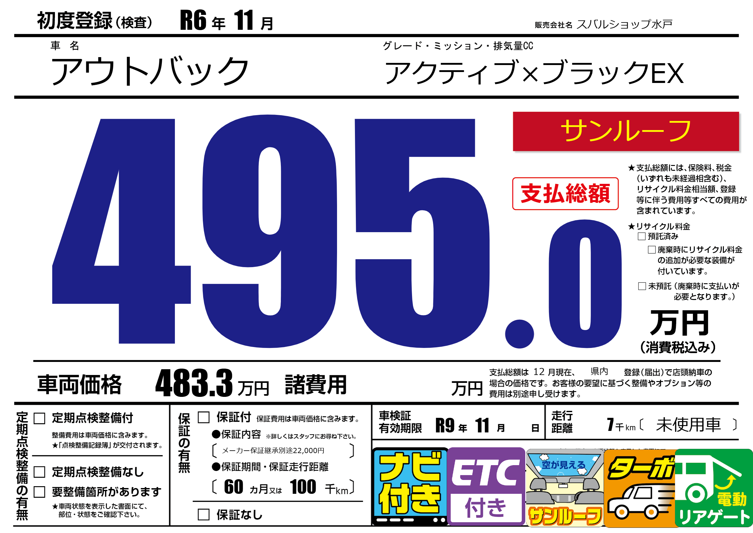 | 走行キロ | 0.7万km | 初年度登録 | R6年11月 |