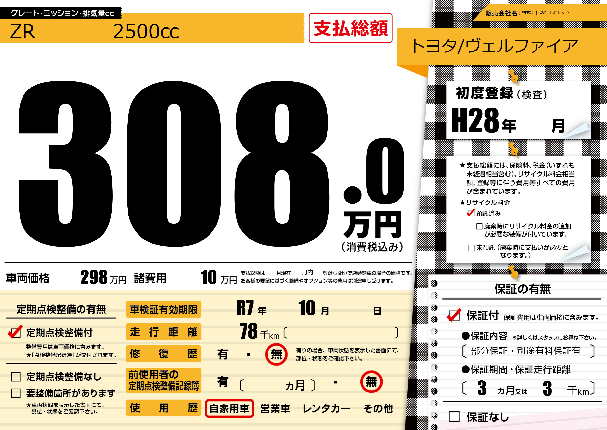 | 車名 | トヨタ/ヴェルファイア | グレード ミッション 排気量 |