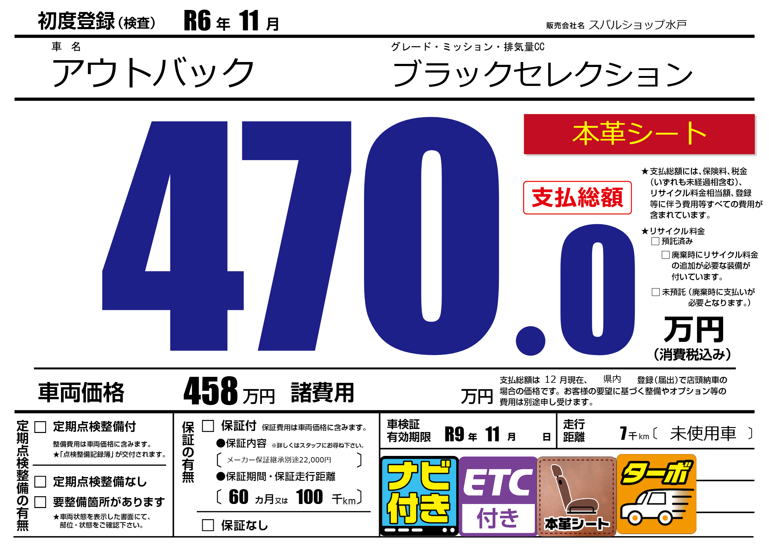 | 車名 | アウトバック | グレード ミッション 排気量 |