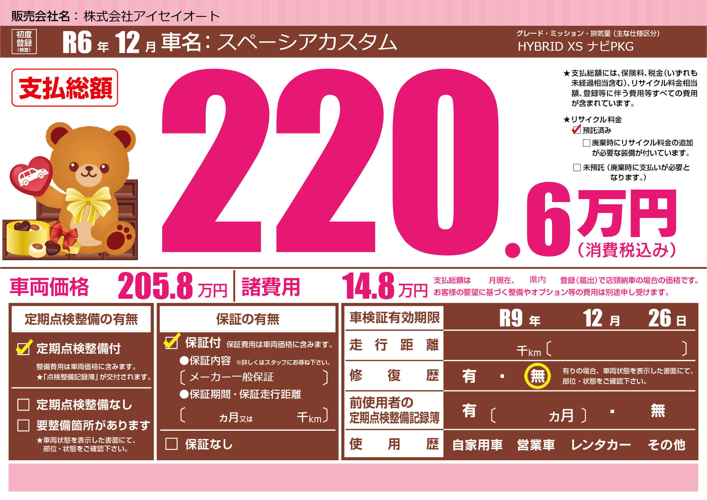 なし | 車検制限 | R9年12月26月 |