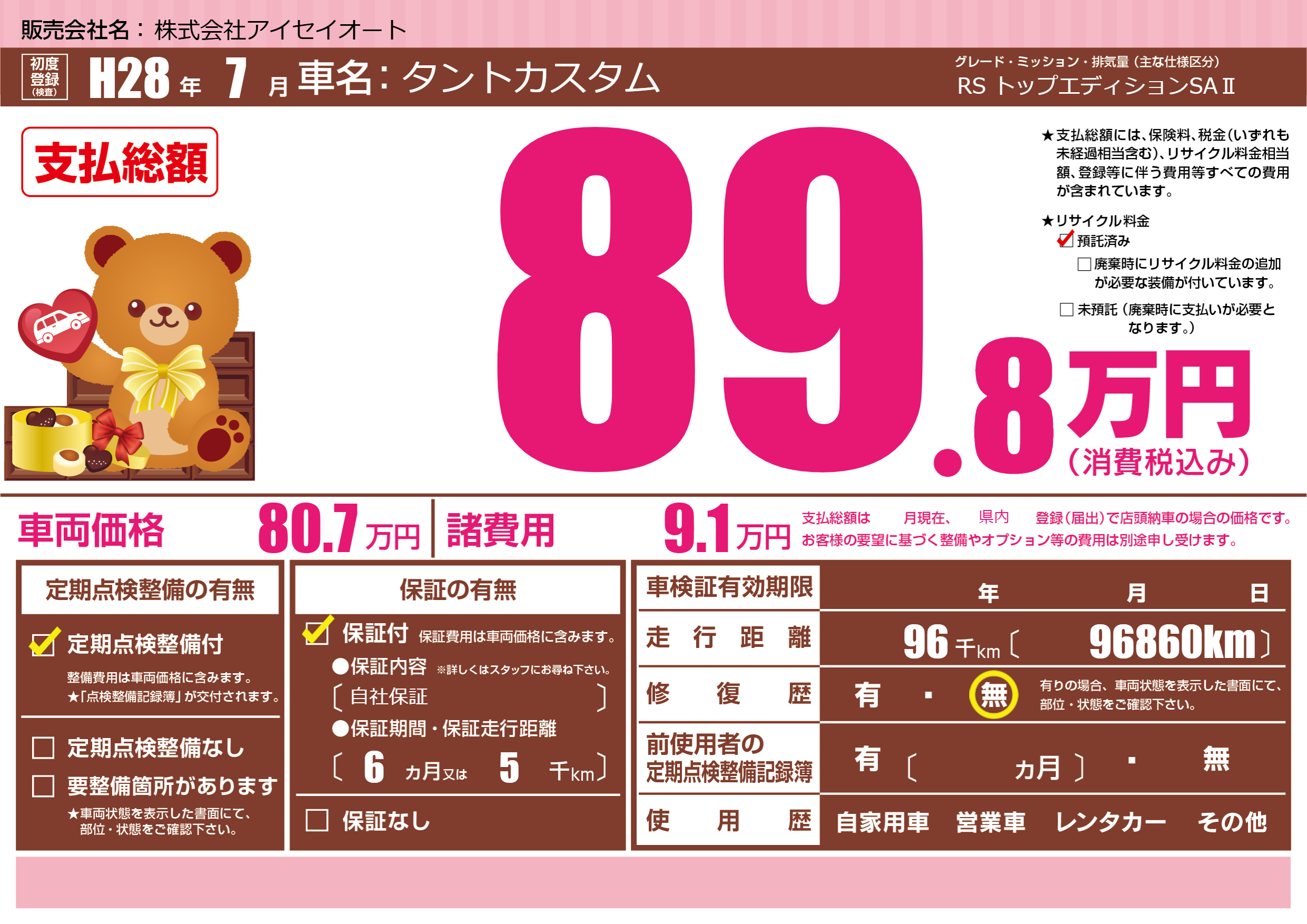 | 車名 | タントカスタム | グレード ミッション 排気量 |
