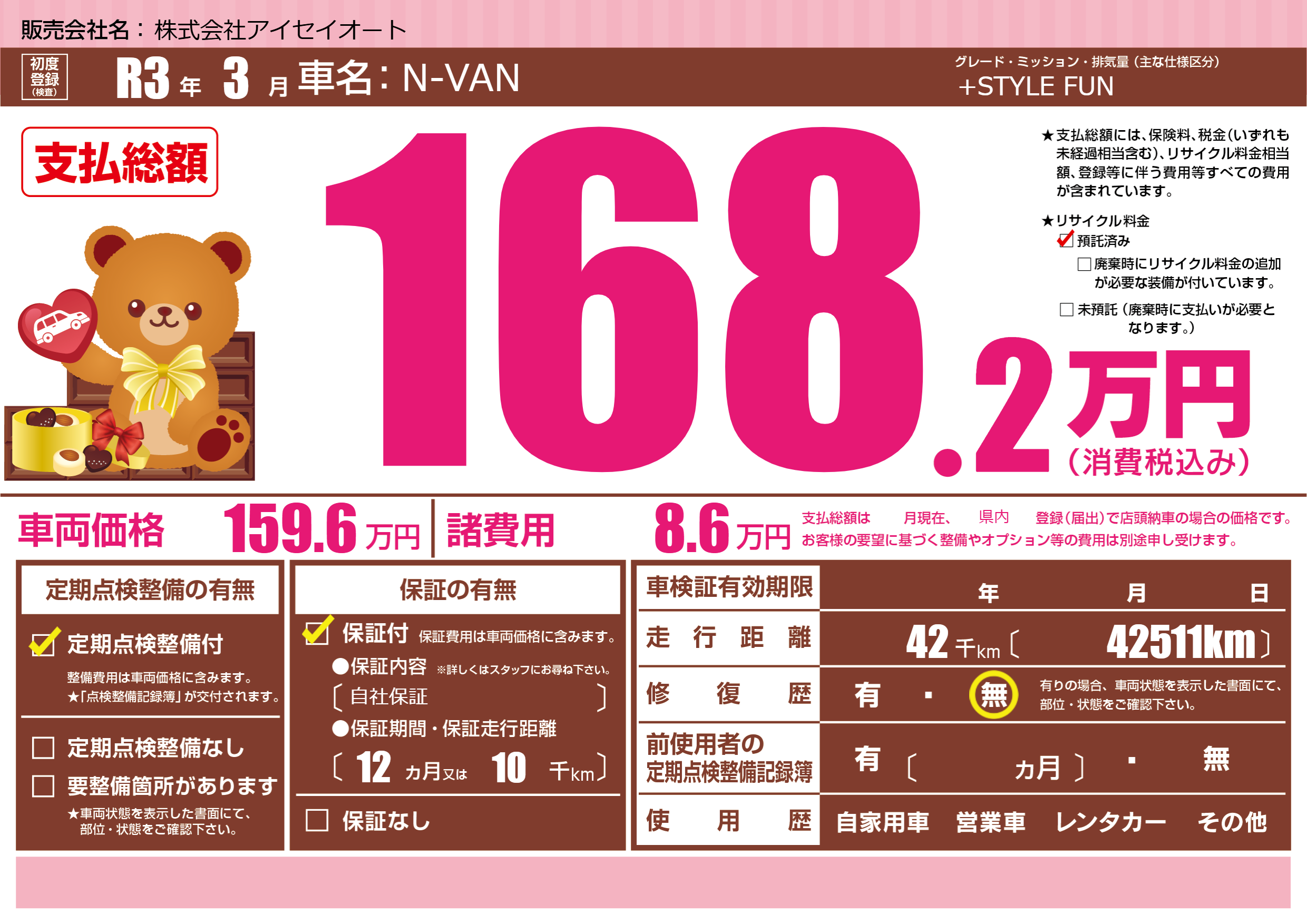 | 車名 | N-VAN | グレード ミッション 排気量 |