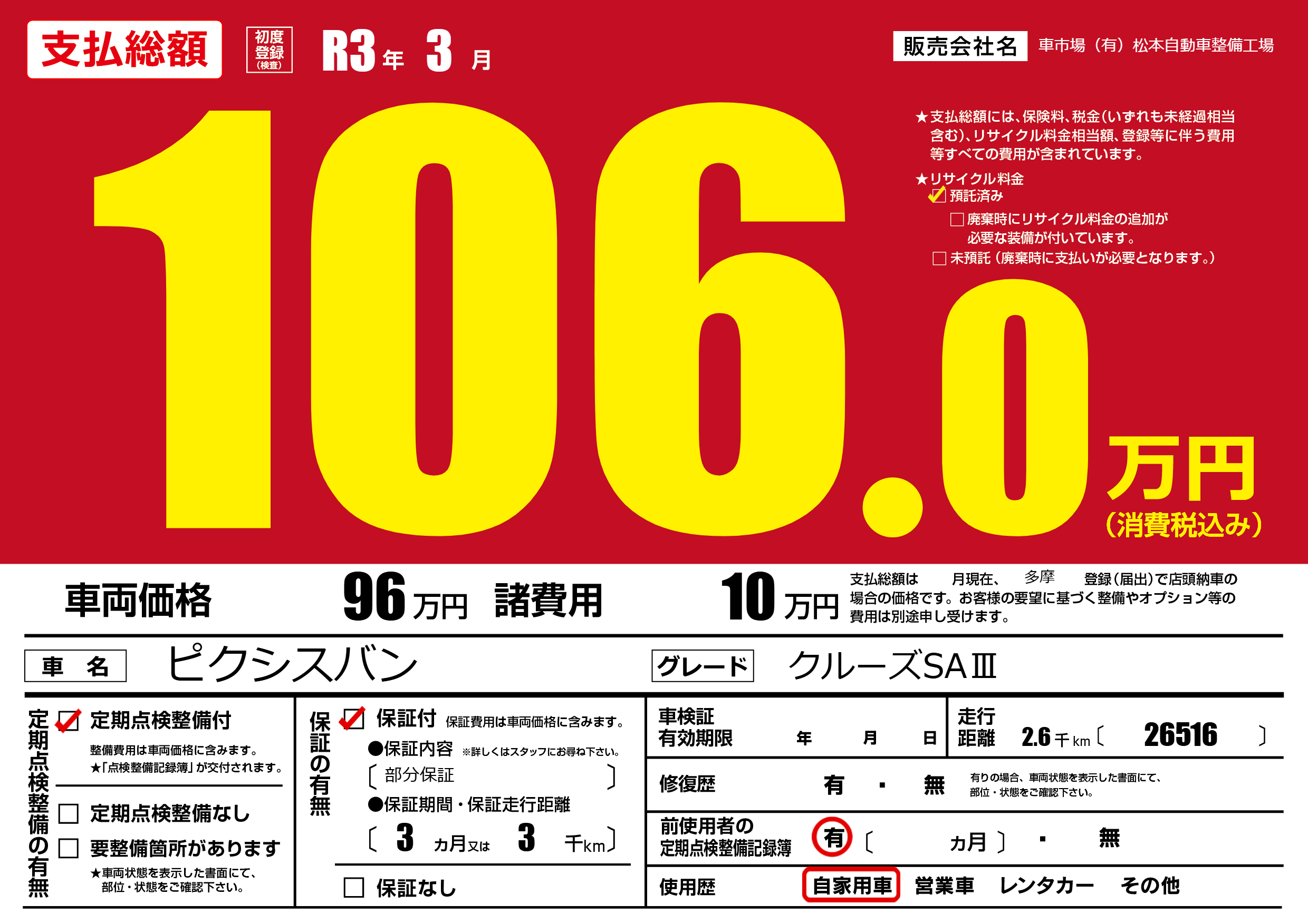 保証付き 保証内容(部分保証) 3ヶ月または(3)千kmまで |