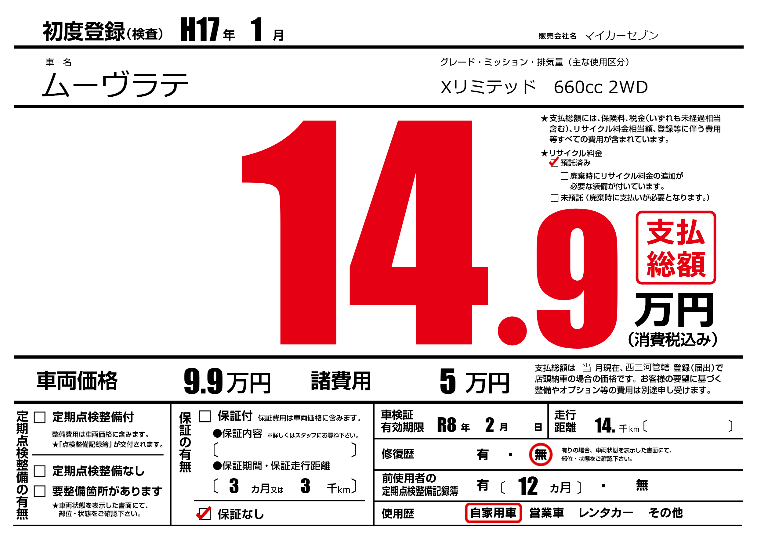 | 車名 | ムーヴラテ | グレード ミッション 排気量 |