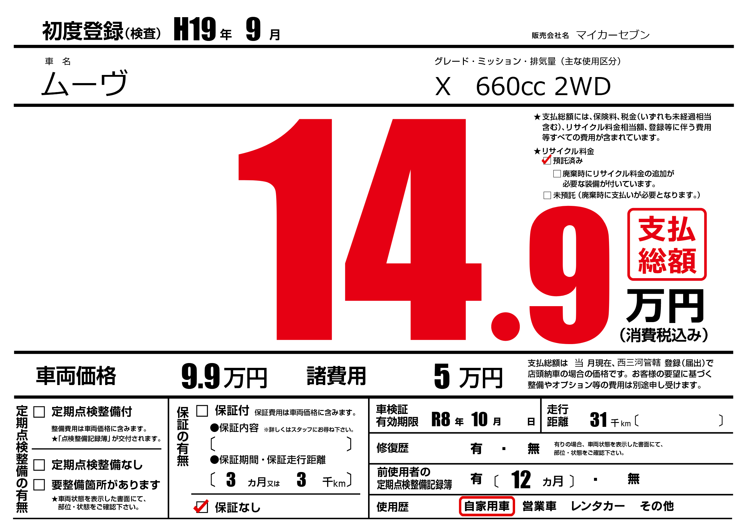 | 走行キロ | 3.1万km | 初年度登録 | H19年9月 |