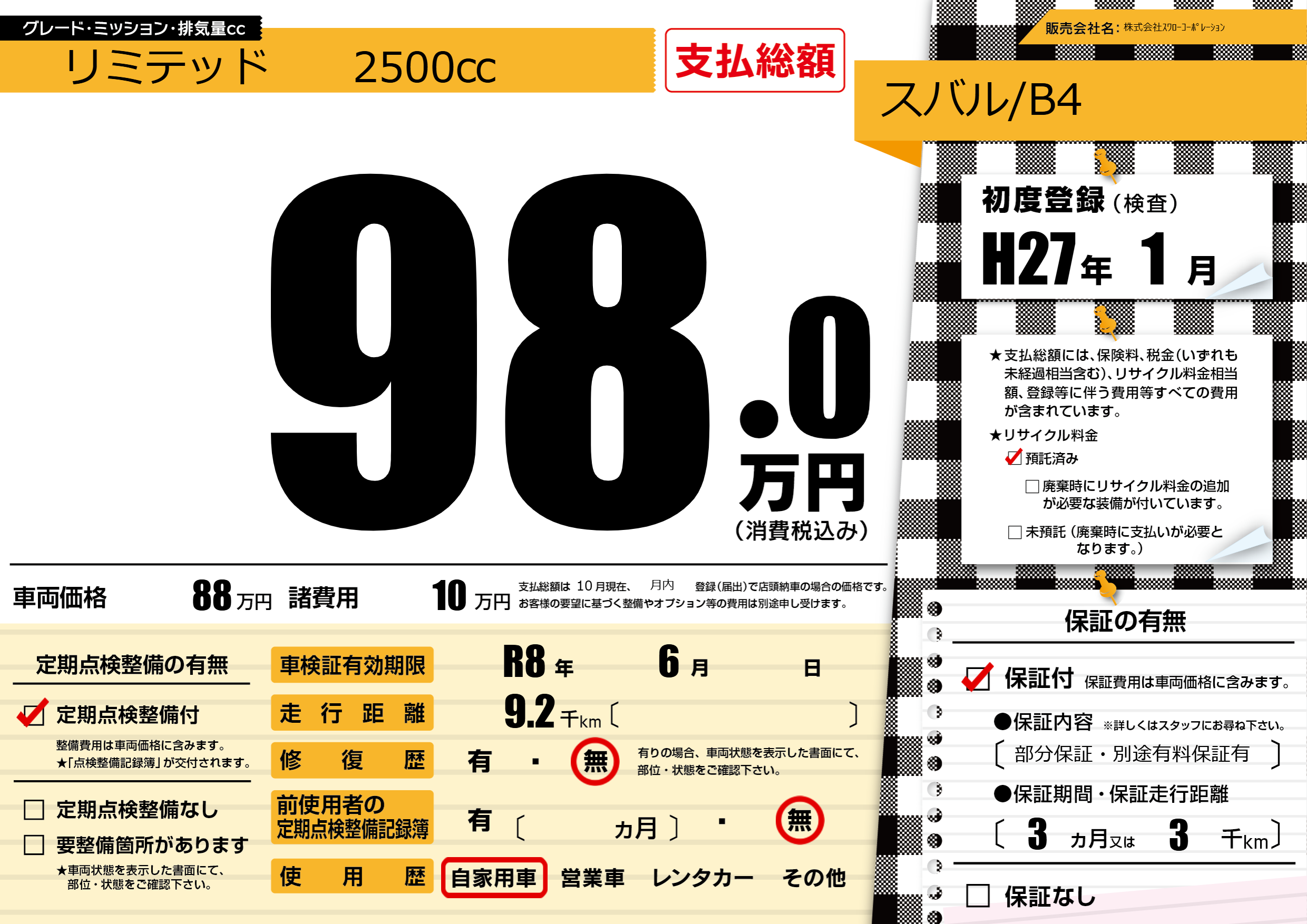 | 車名 | スバル/B4 | グレード ミッション 排気量 |