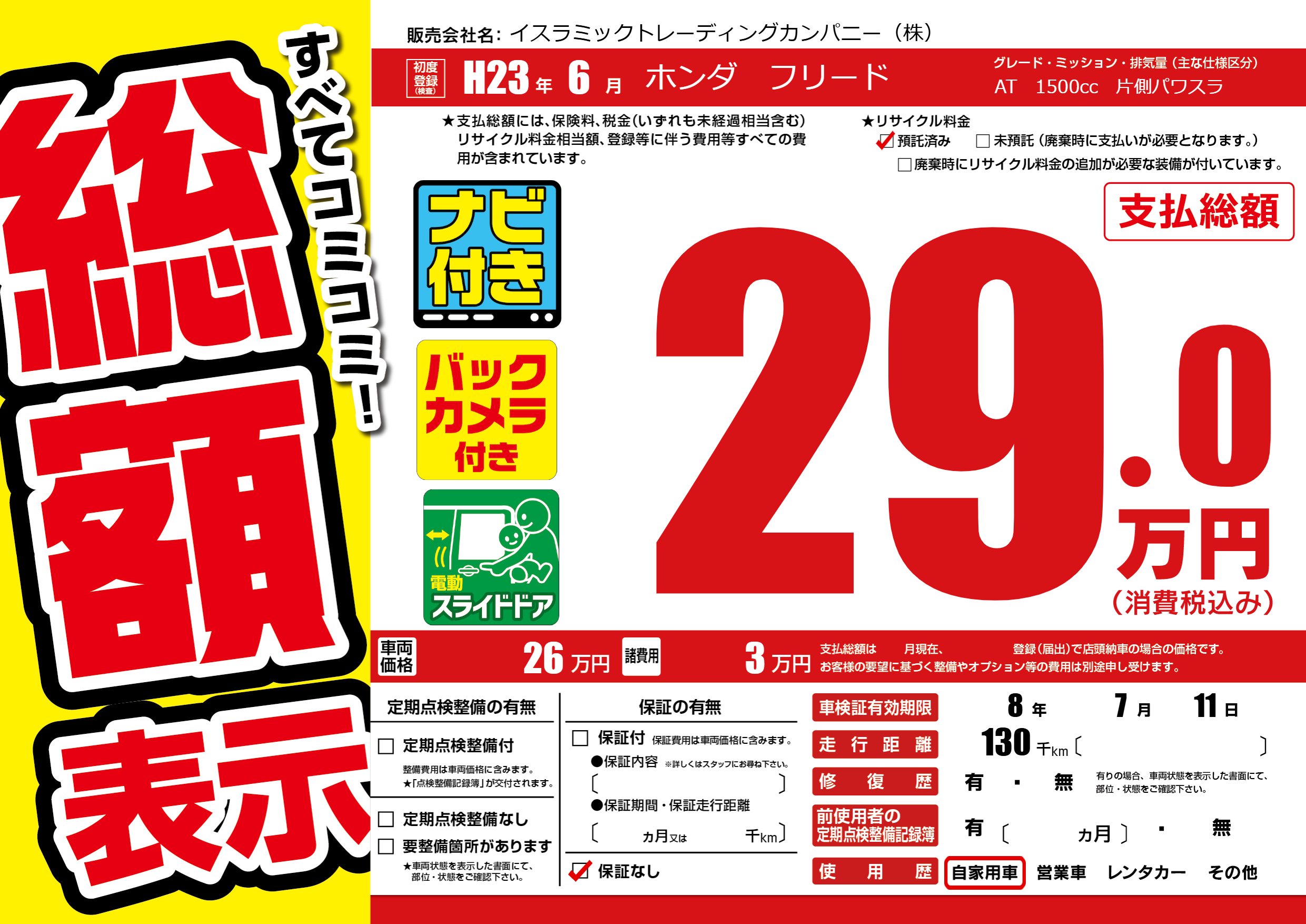 | 車名 | ホンダ フリード | グレード ミッション 排気量 |