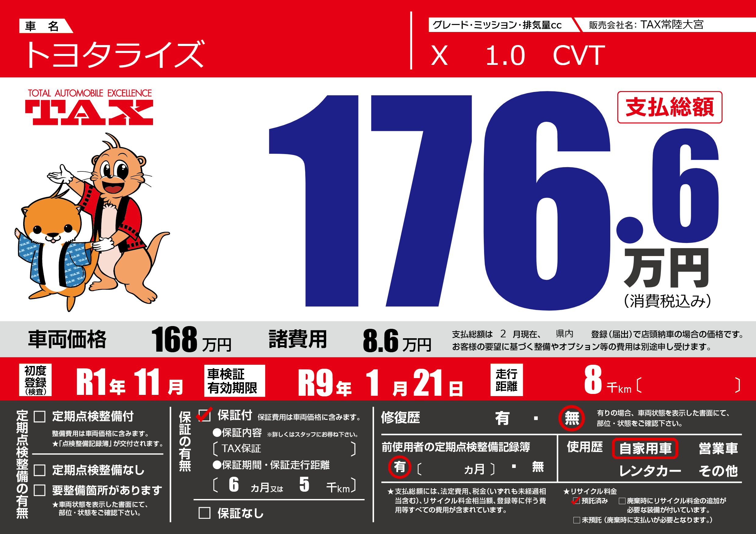 保証付き 保証内容(TAX保証) 6ヶ月または(5)千kmまで |