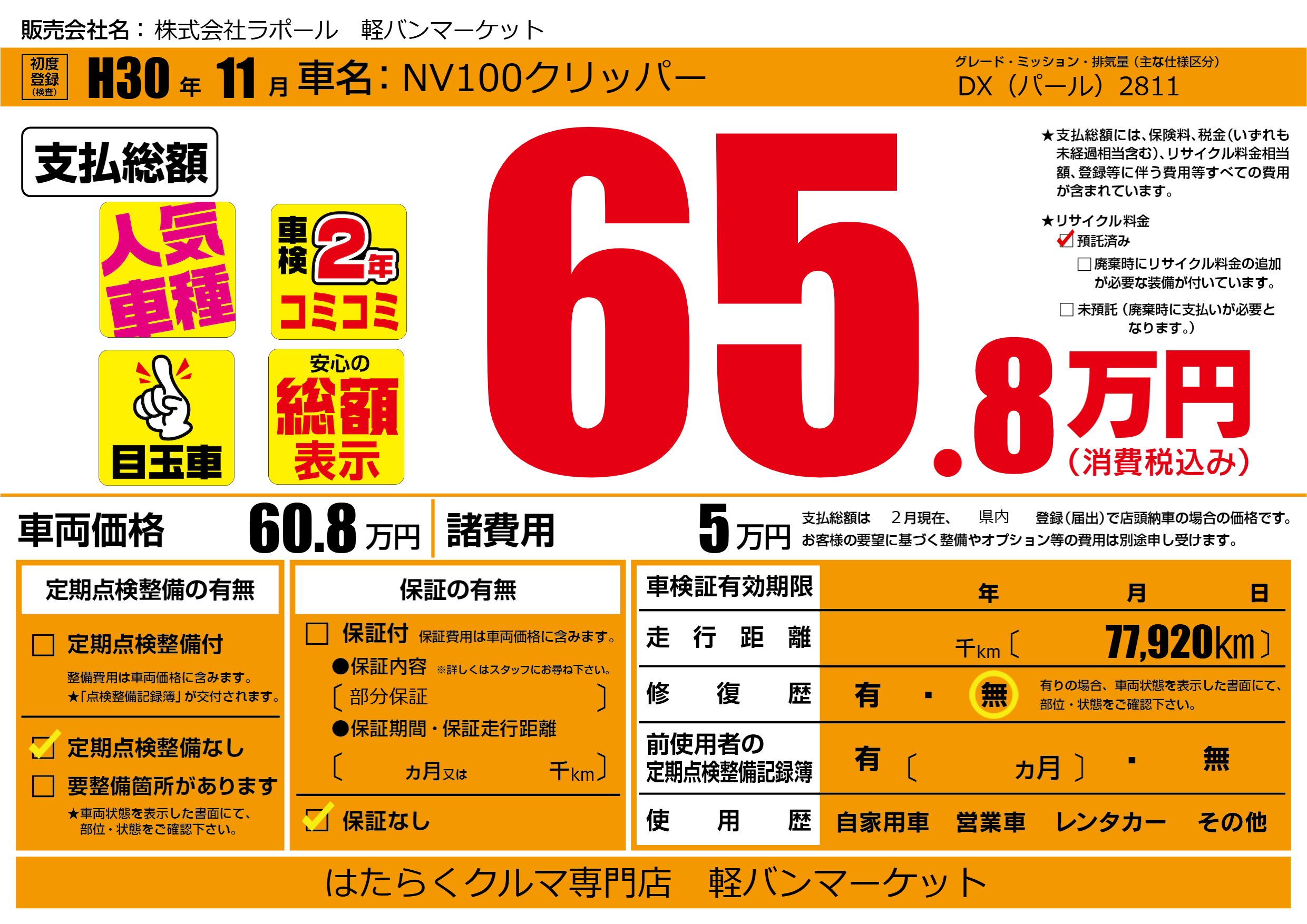 保証なし 保証内容(部分保証) ---ヶ月または()千kmまで |