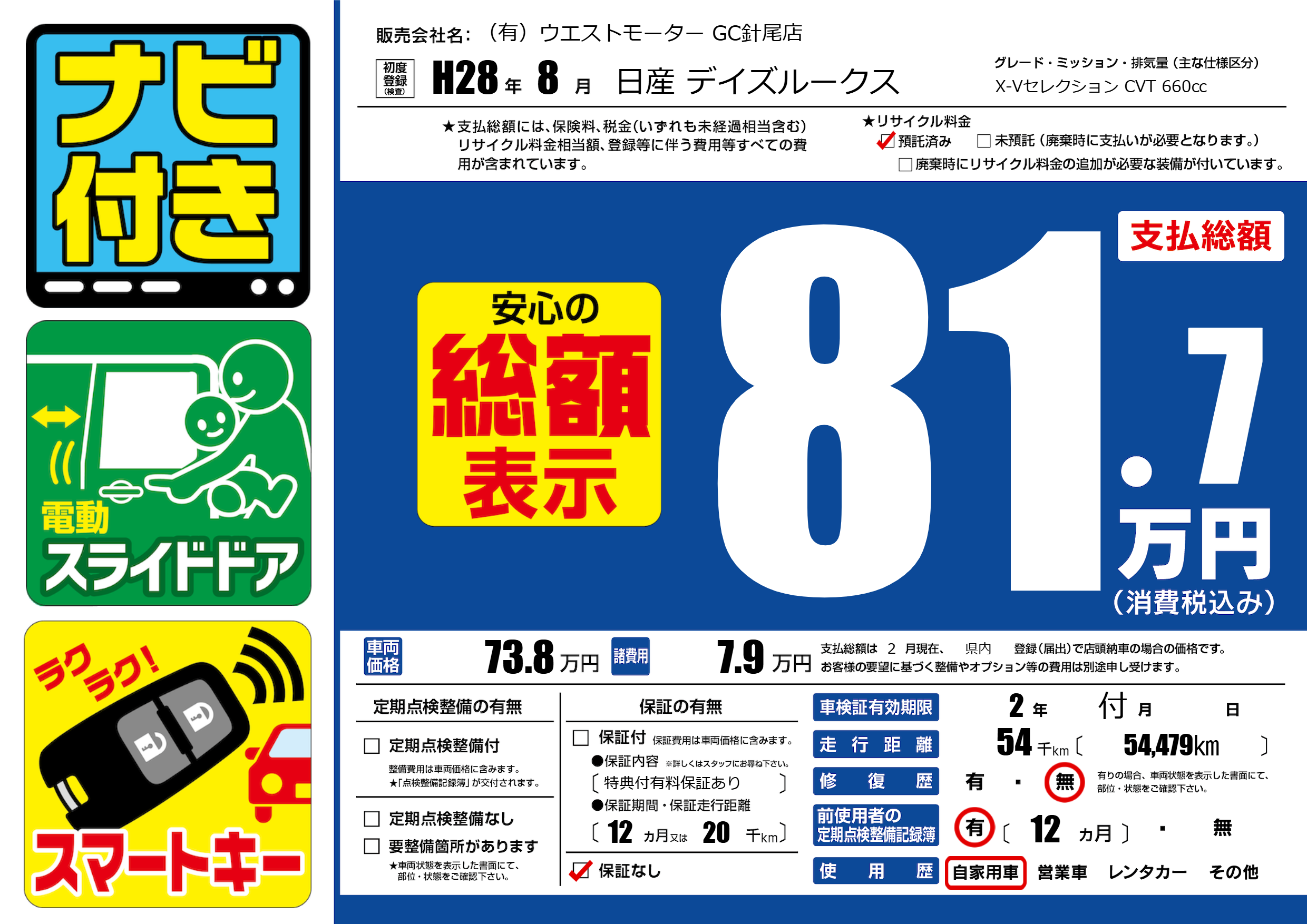 | 走行キロ | 5.4万km | 初年度登録 | H28年8月 |