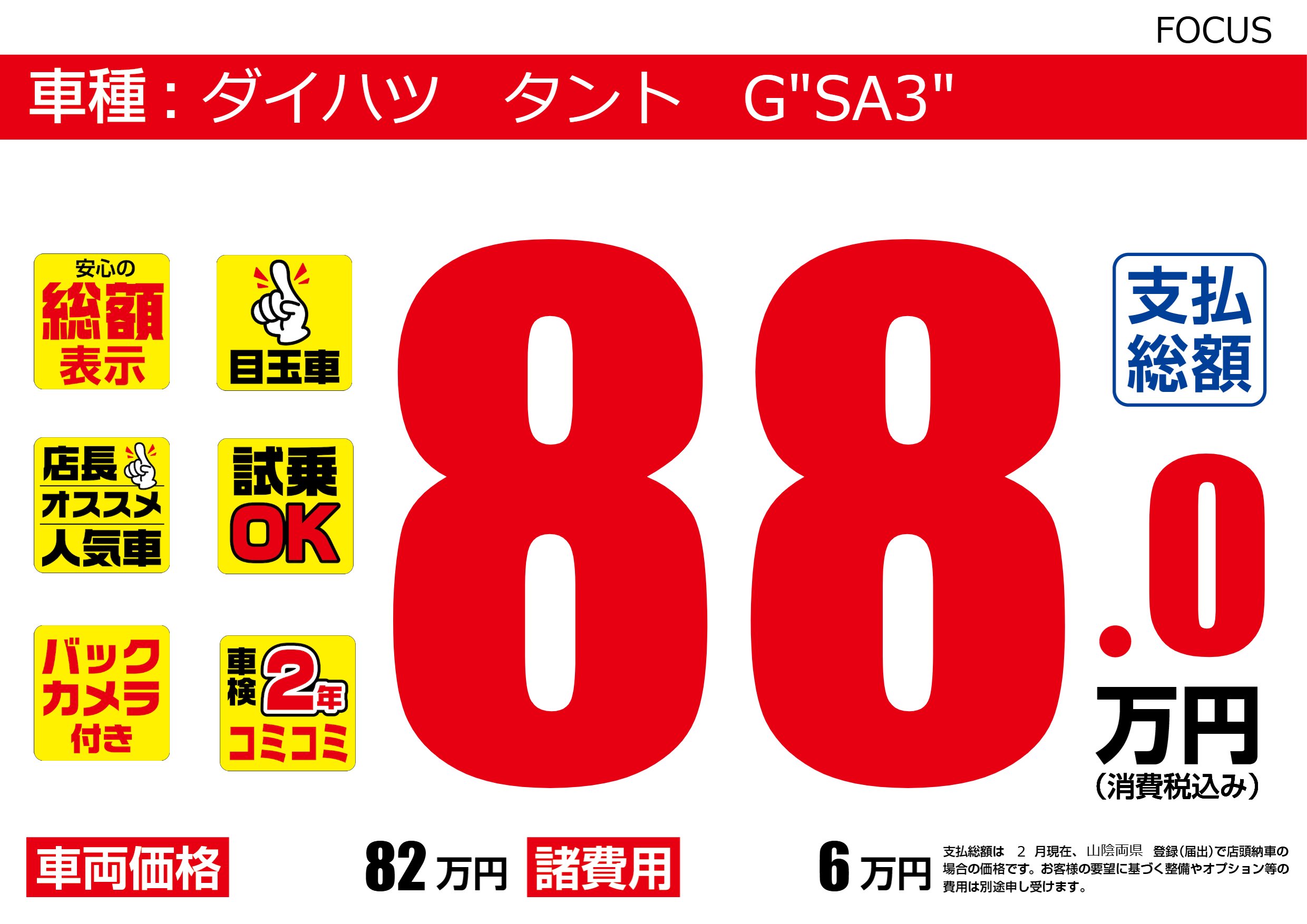 | 車名 | ダイハツ タント G"SA3" | グレード ミッション 排気量 |