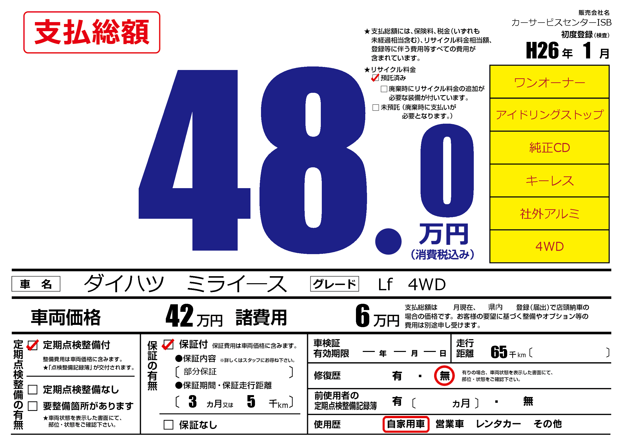 | 走行キロ | 6.5万km | 初年度登録 | H26年1月 |