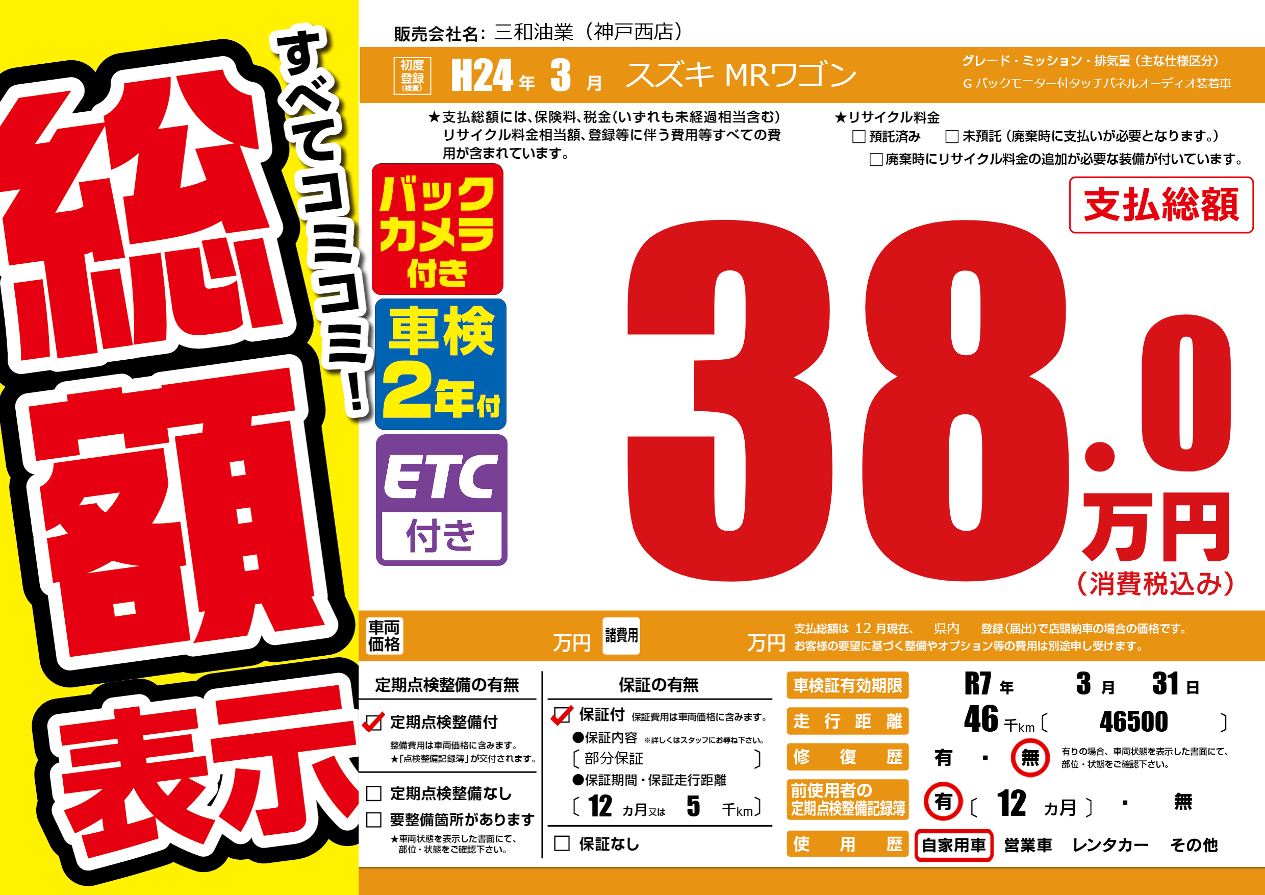 | 車名 | スズキ MRワゴン | グレード ミッション 排気量 |