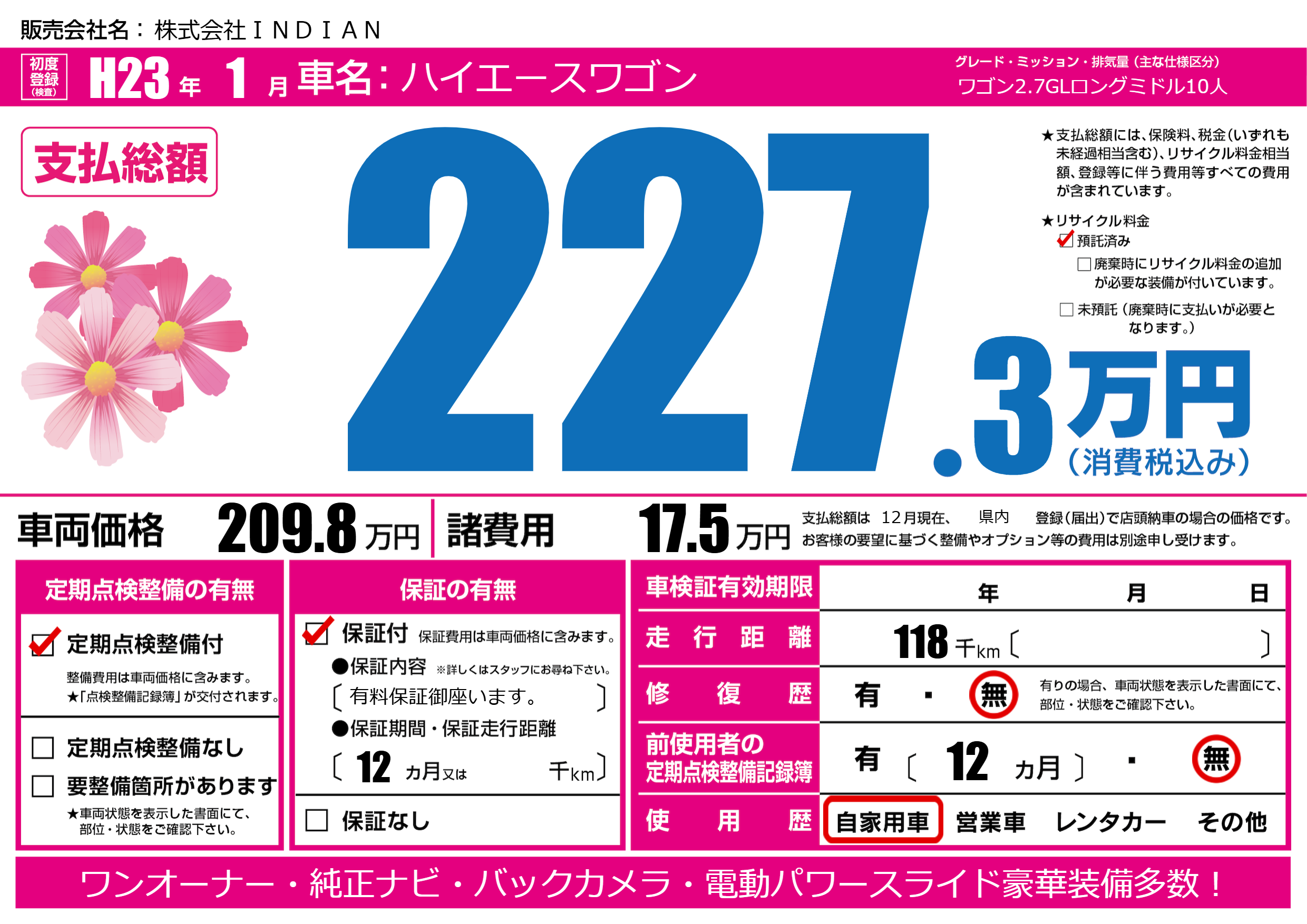 | 走行キロ | 11.8万km | 初年度登録 | H23年1月 |