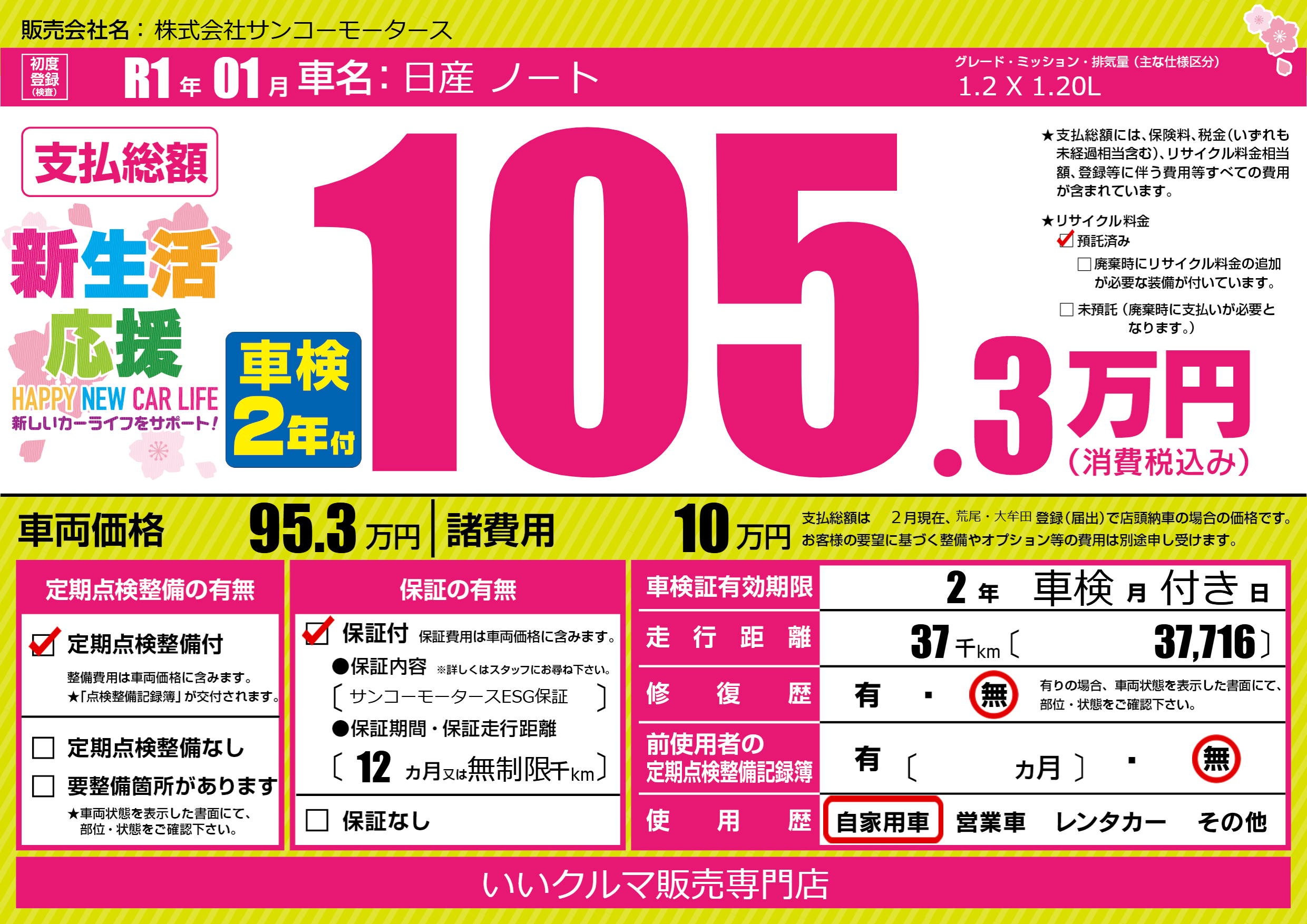 | 車名 | 日産 ノート | グレード ミッション 排気量 |