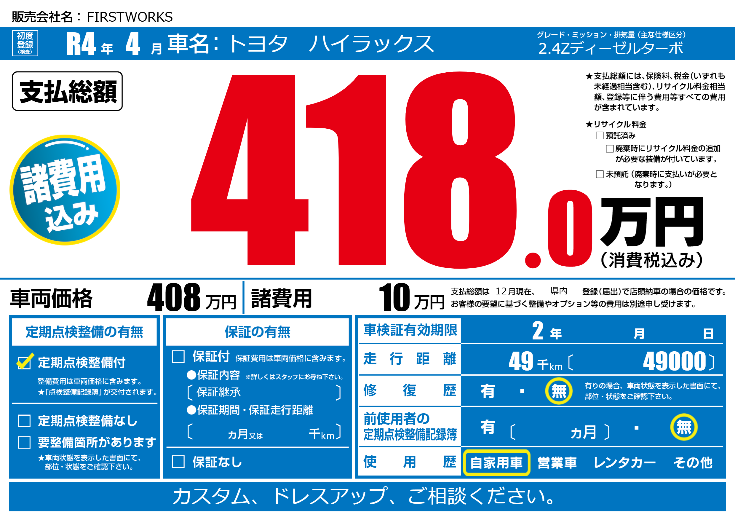 | 車名 | トヨタ ハイラックス | グレード ミッション 排気量 |