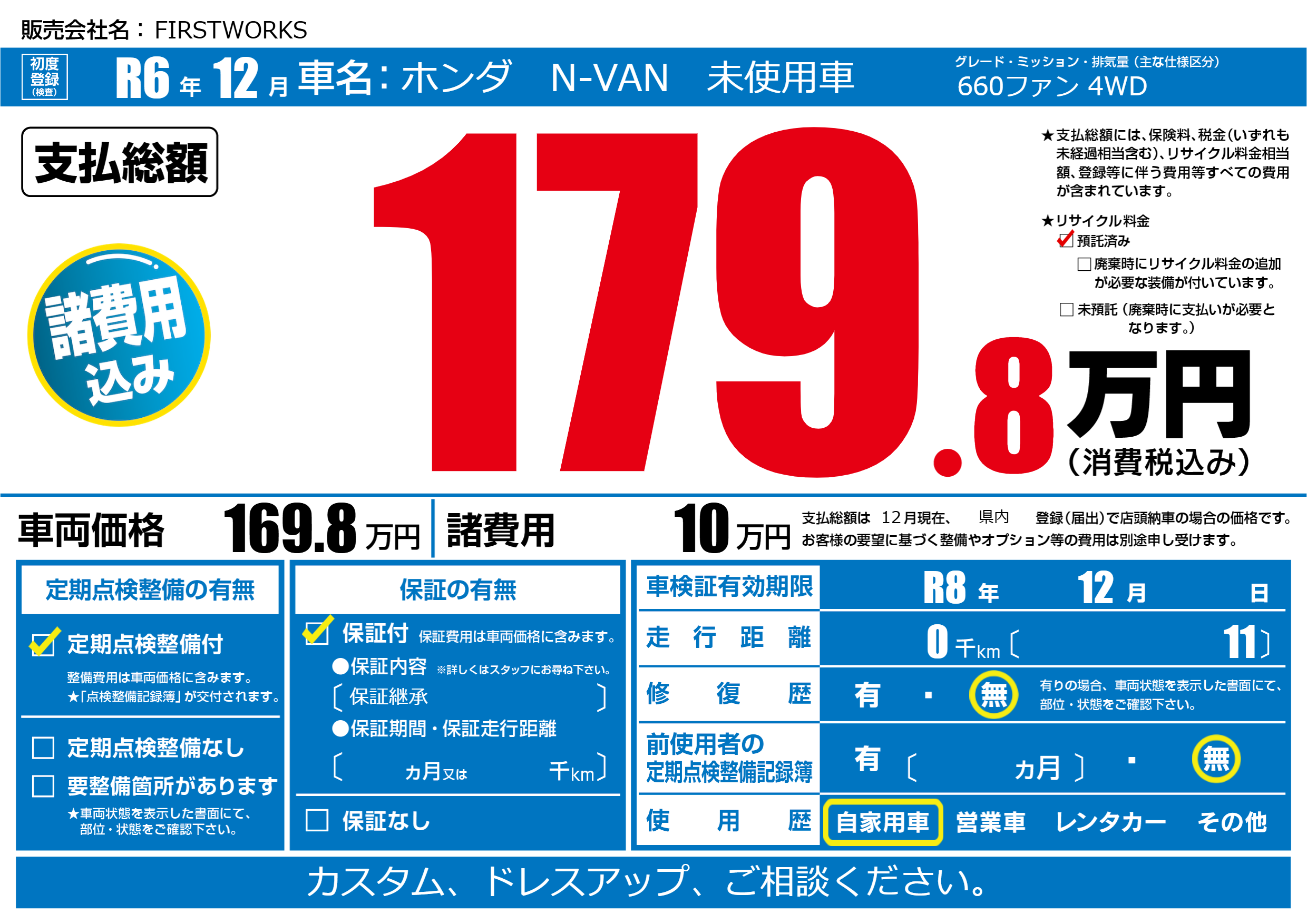 | 車名 | ホンダ N-VAN 未使用車 | グレード ミッション 排気量 |