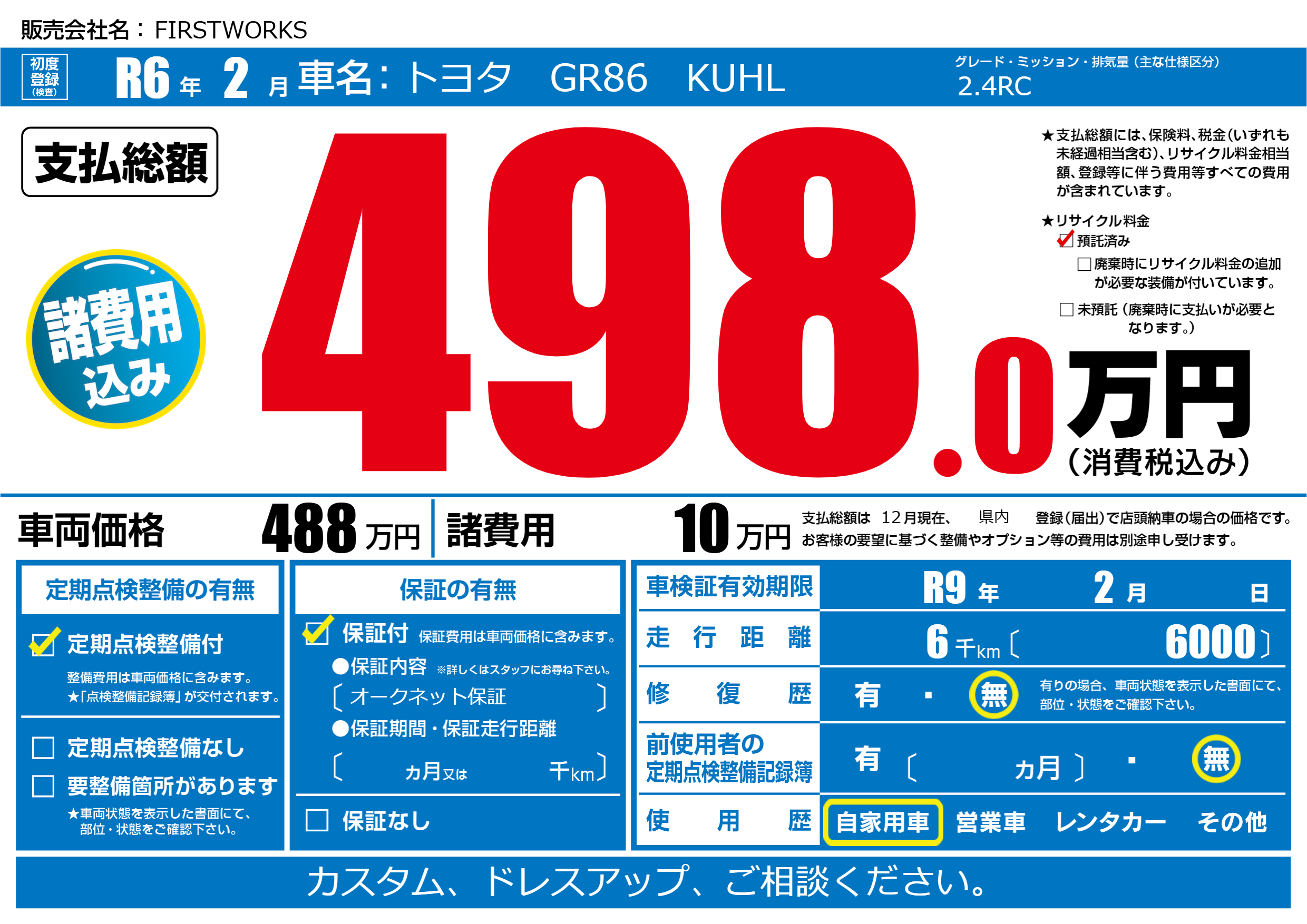 | 車検制限 | R9年 2月 - 日 | ||