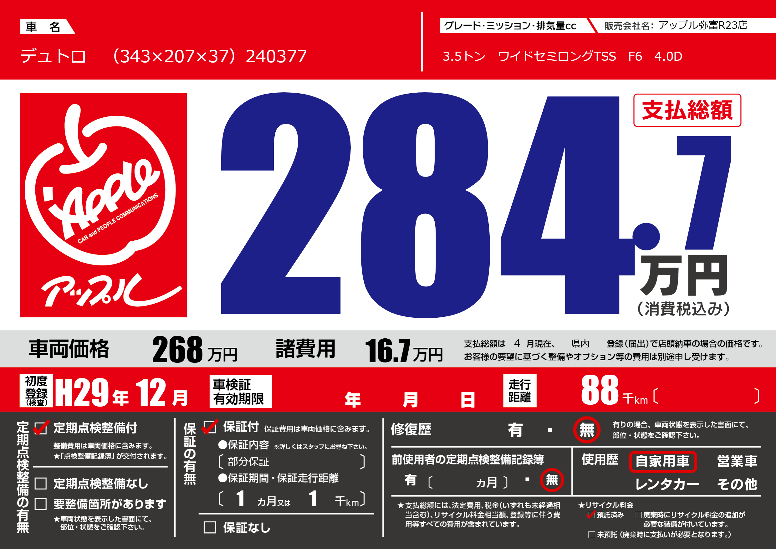 | 車名 | デュトロ (343×207×37)240377 | グレード ミッション 排気量 |