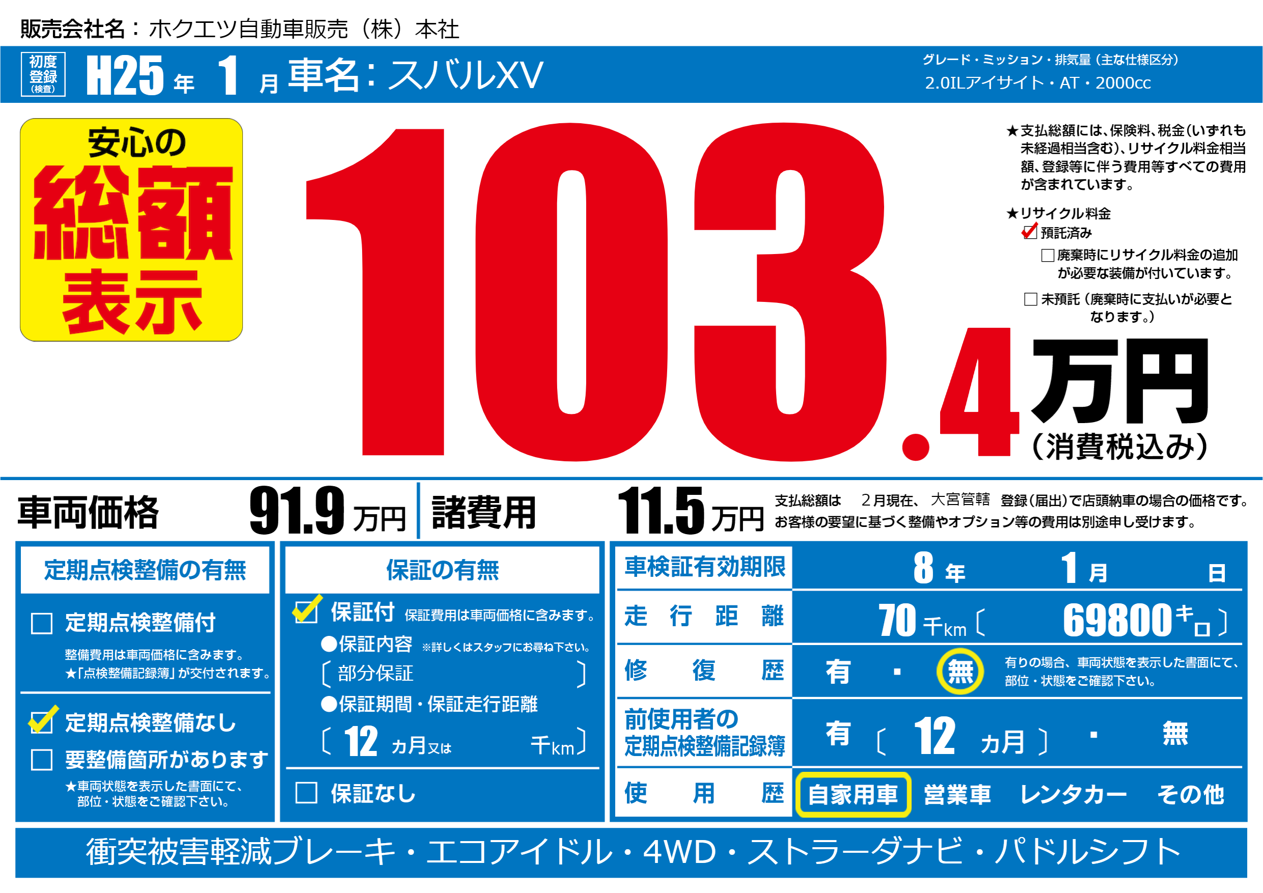 | 車名 | スバルXV | グレード ミッション 排気量 |