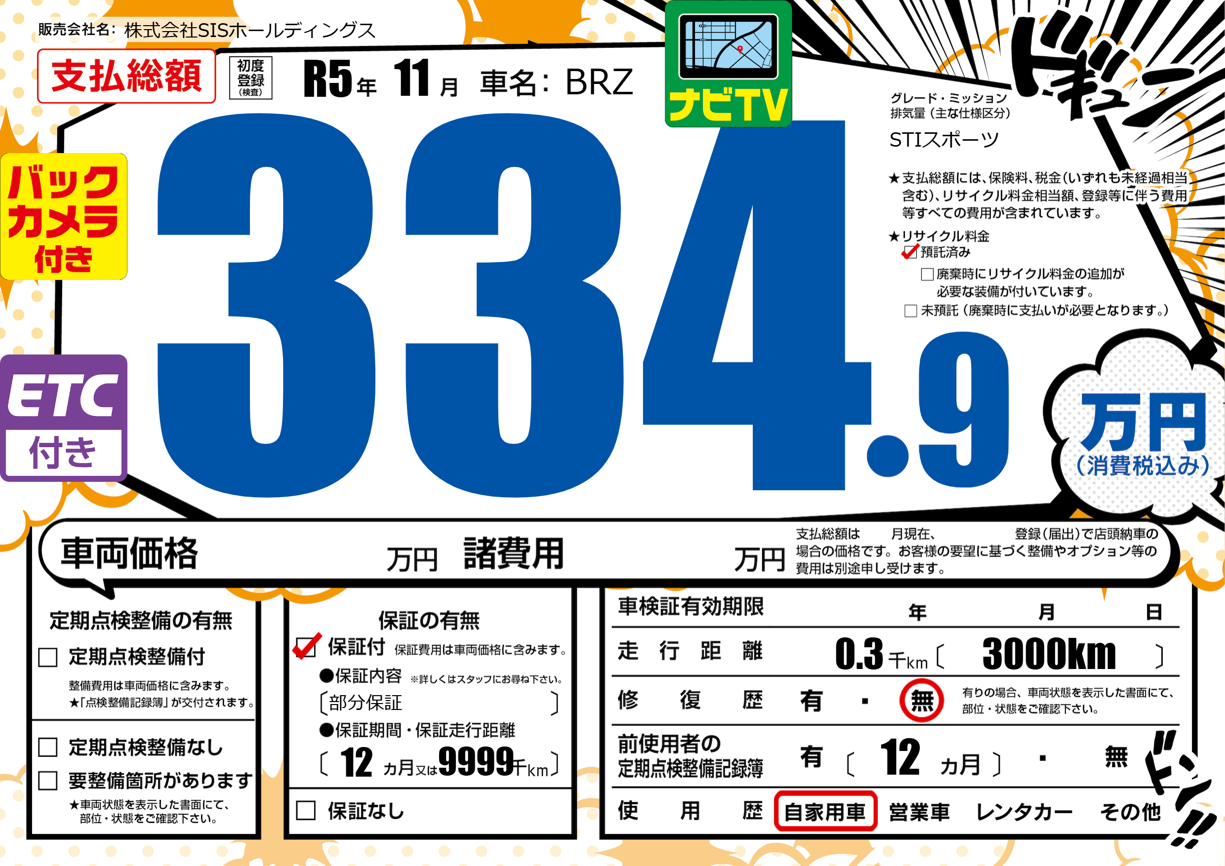 | 車名 | BRZ | グレード ミッション 排気量 |