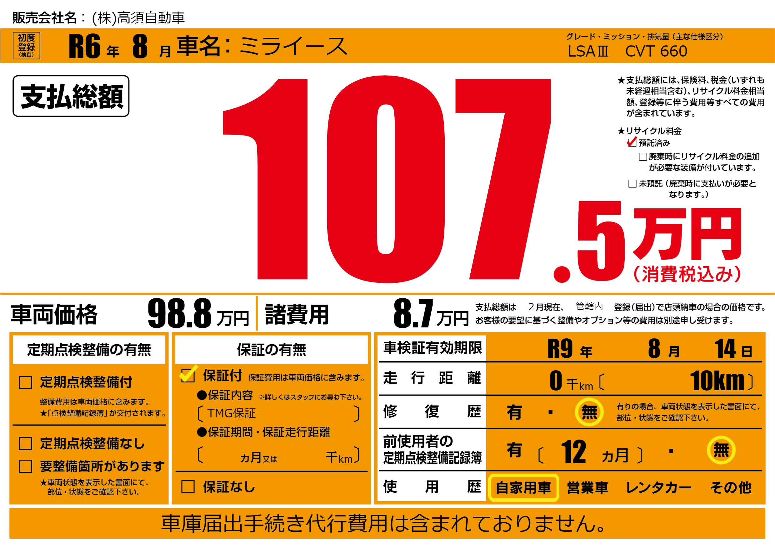 保証付き 保証内容(TMG保証) ---ヶ月または()千kmまで |
