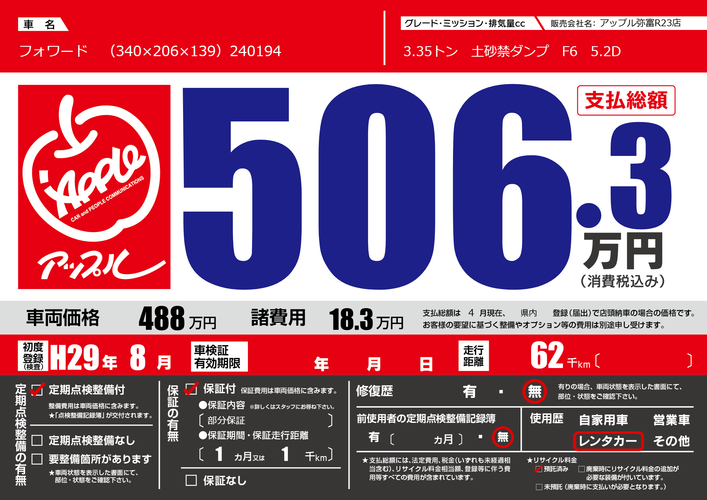 | 車名 | フォワード (340×206×139)240194 | グレード ミッション 排気量 |