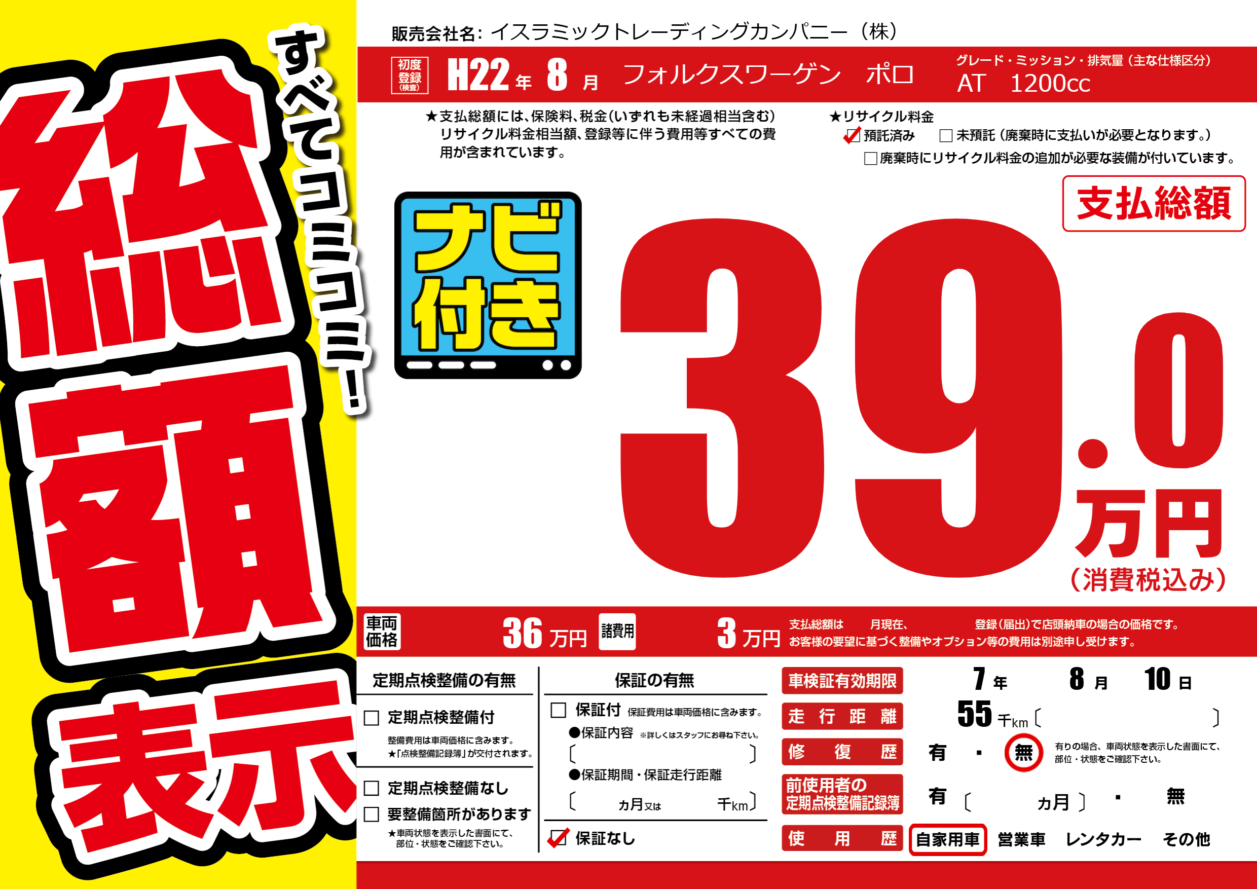 | 車名 | フォルクスワーゲン ポロ | グレード ミッション 排気量 |