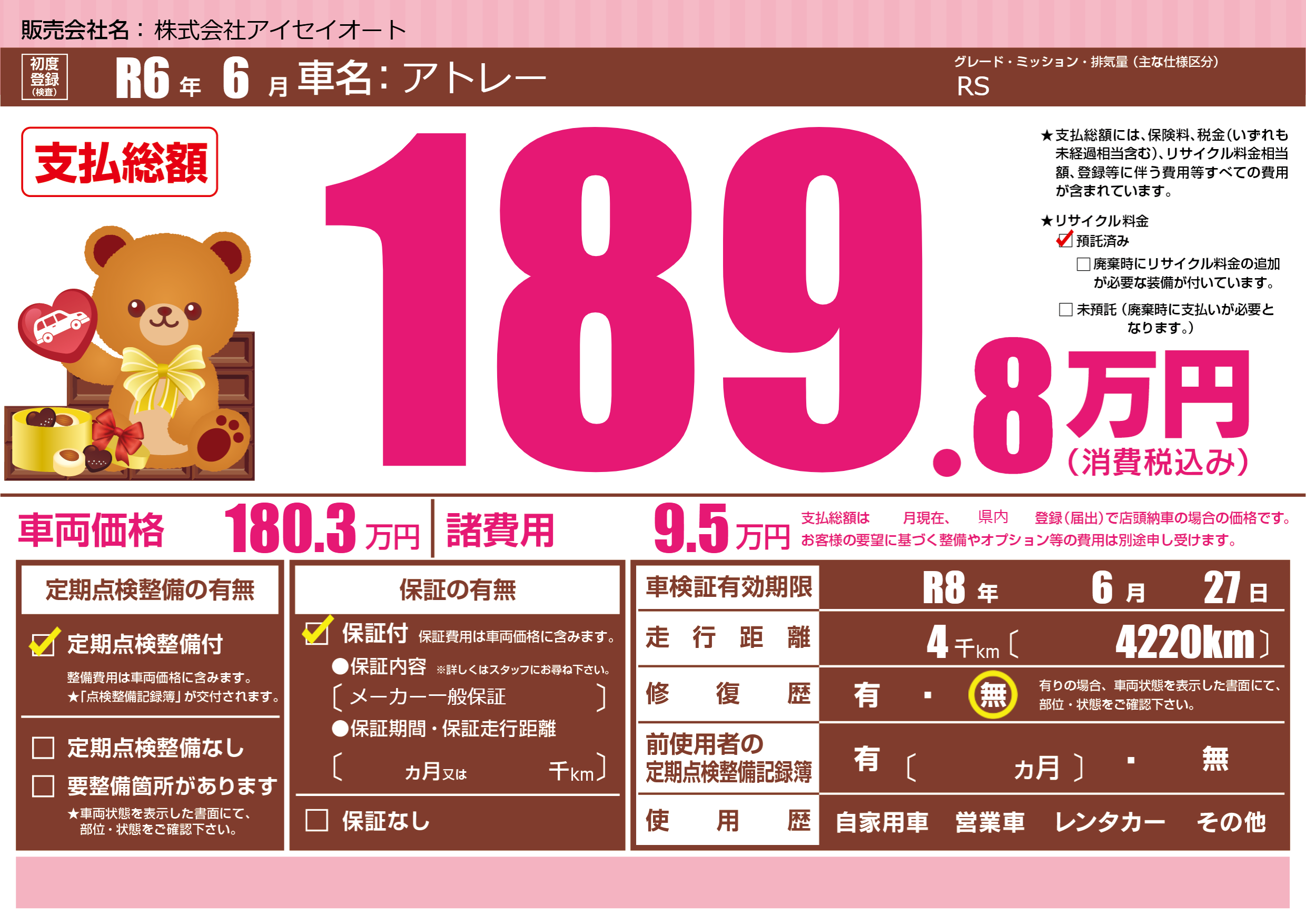 | 車検制限 | R8年 6月 27日 | ||