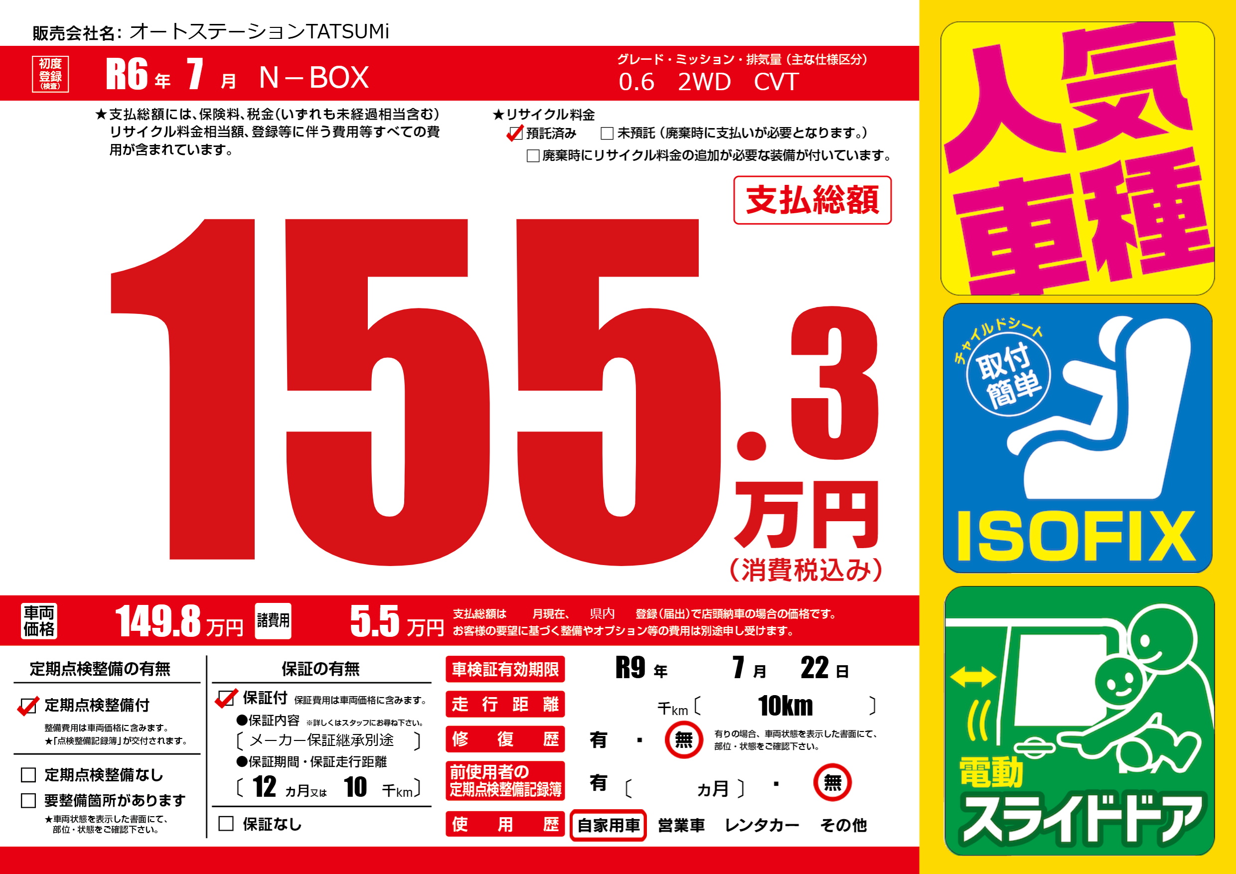 | 車名 | N-BOX | グレード ミッション 排気量 |