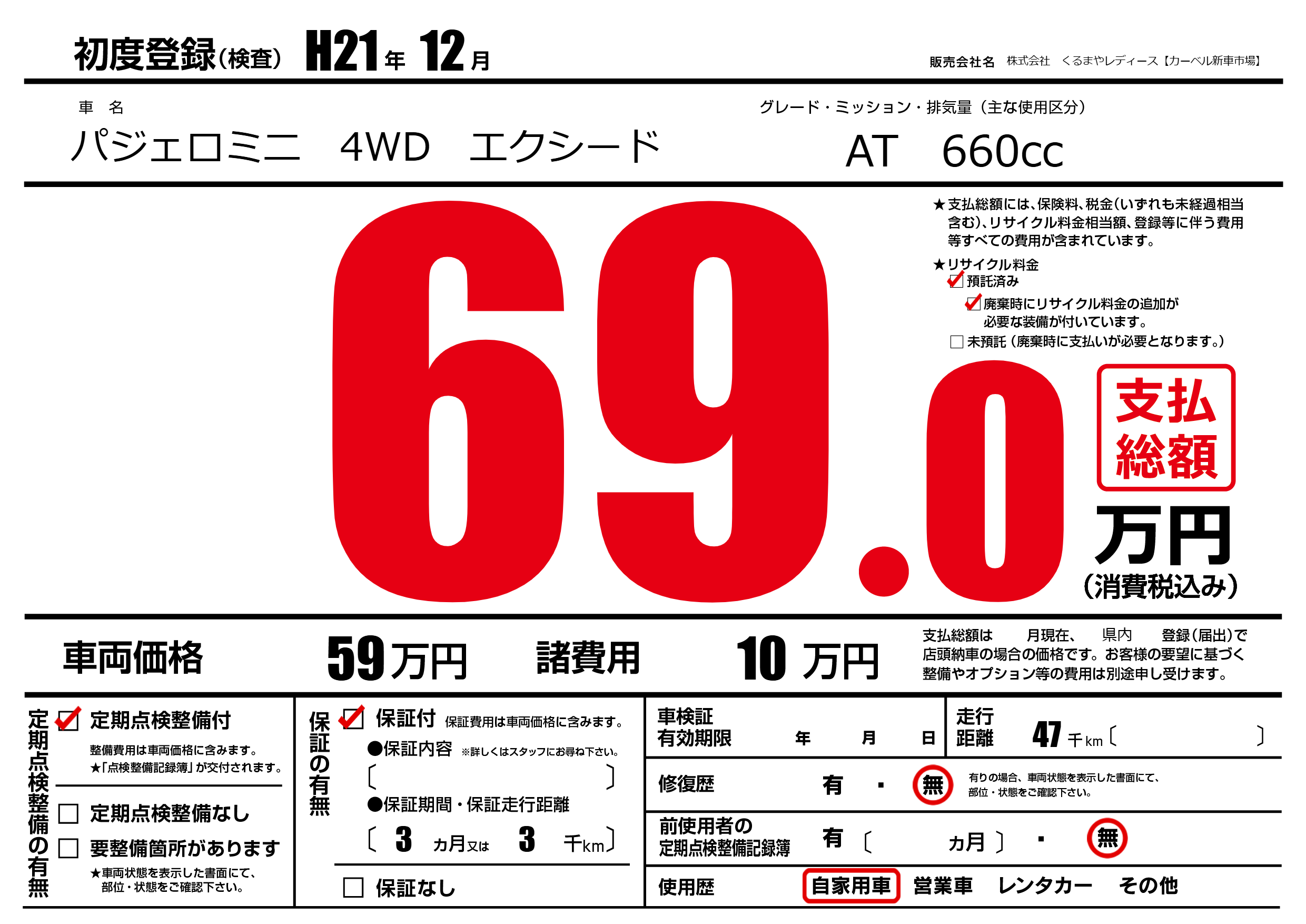 | 車名 | パジェロミニ 4WD エクシード | グレード ミッション 排気量 |