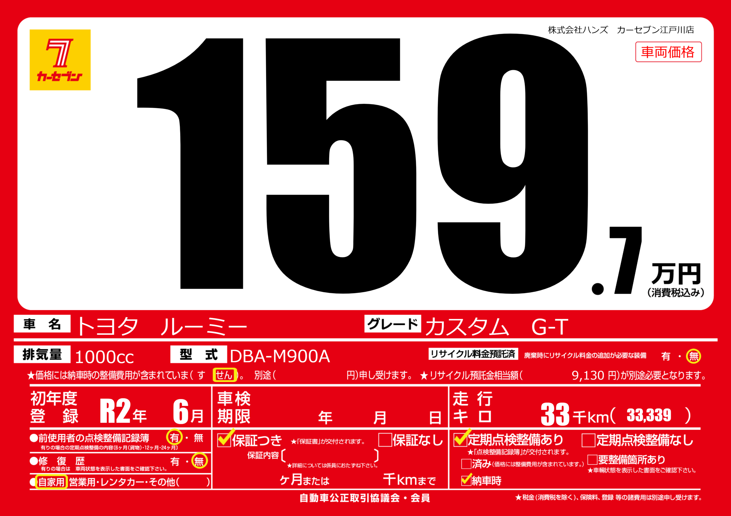 | 走行キロ | 3.3万km | 初年度登録 | R2年6月 |