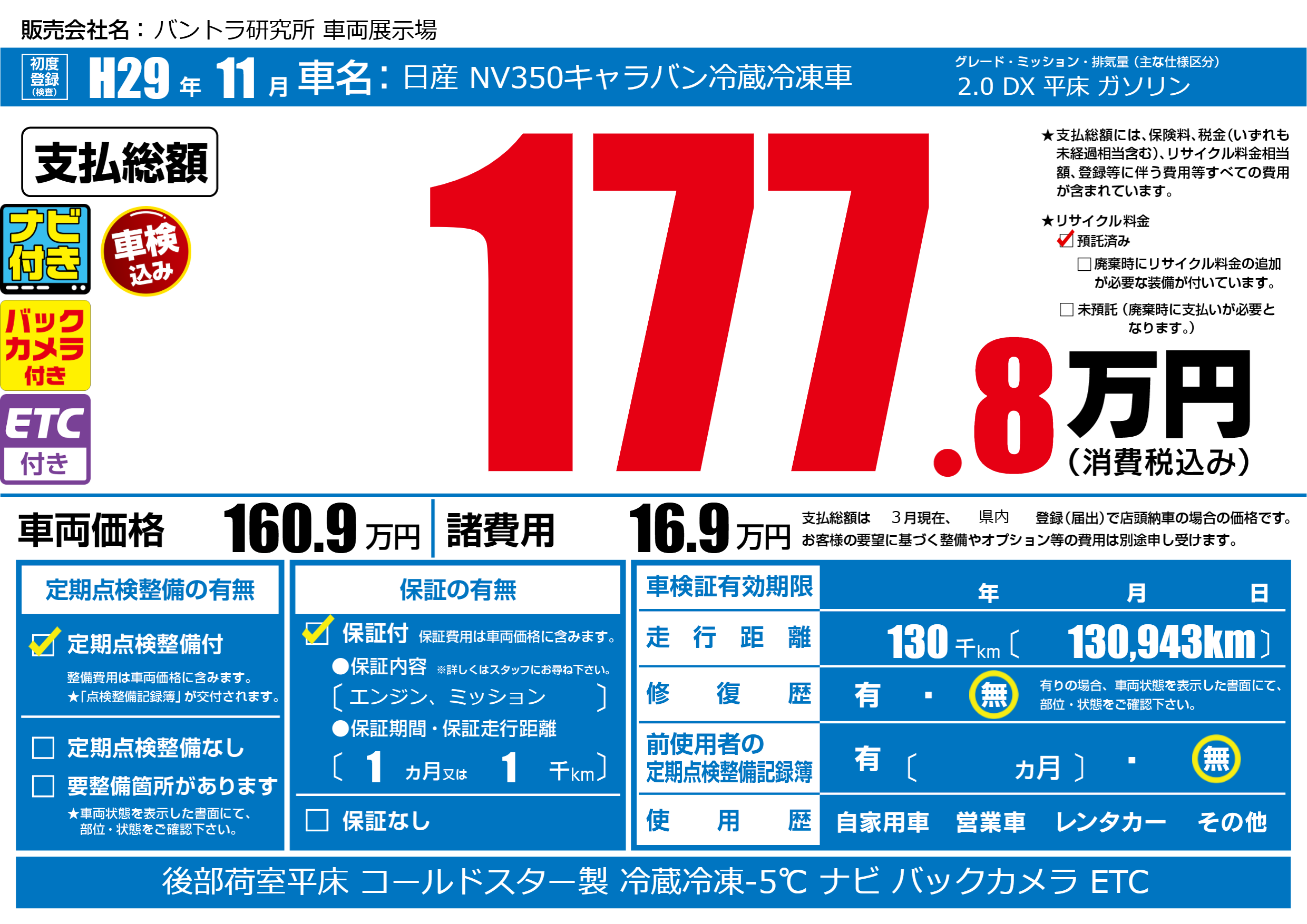 | 車名 | 日産 NV350キャラバン冷蔵冷凍車 | グレード ミッション 排気量 |