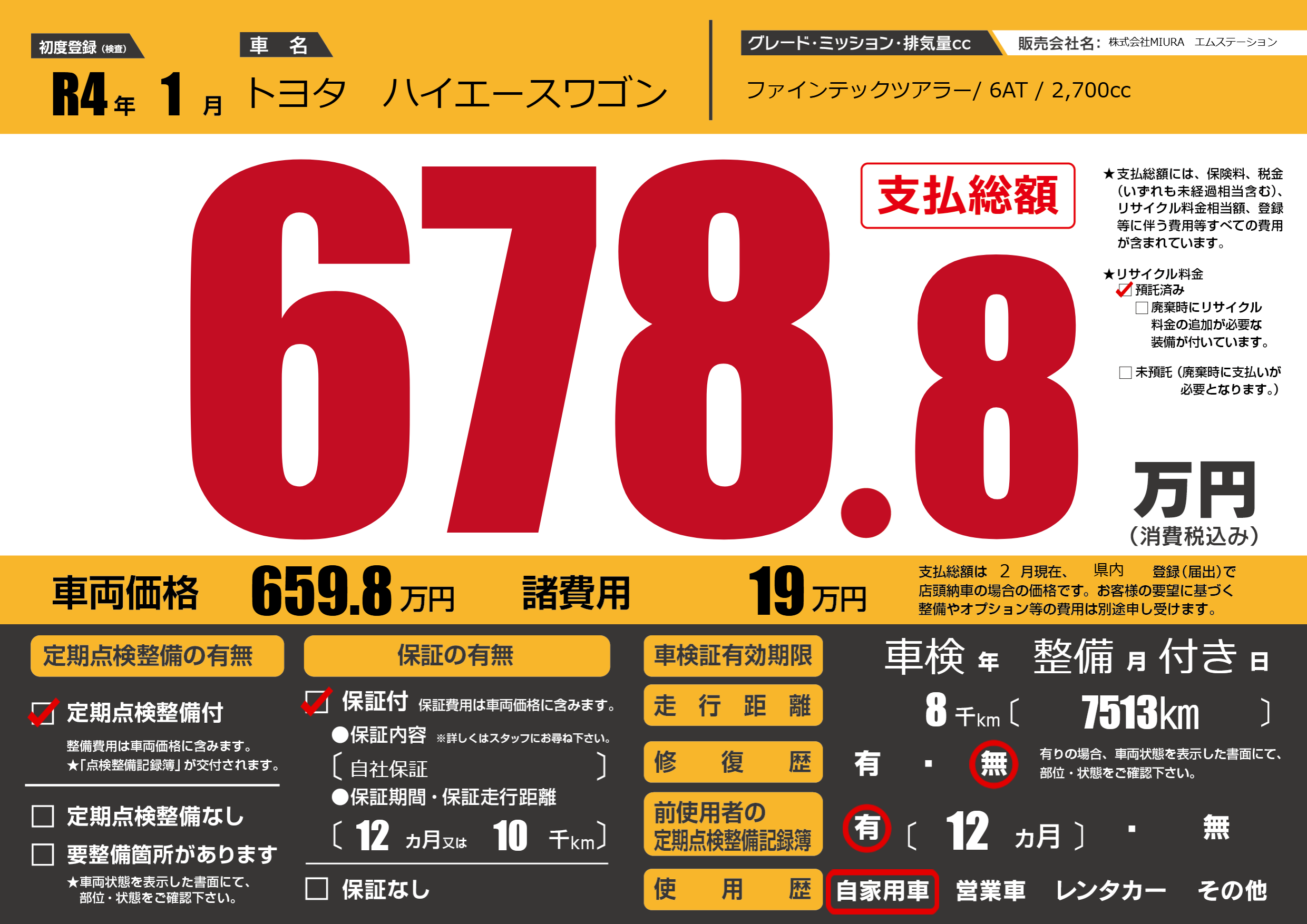 | 走行キロ | 0.8万km | 初年度登録 | R4年1月 |