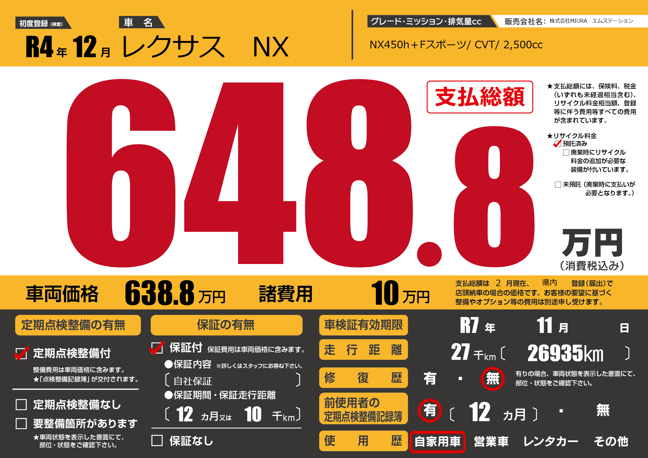 | 走行キロ | 2.7万km | 初年度登録 | R4年12月 |