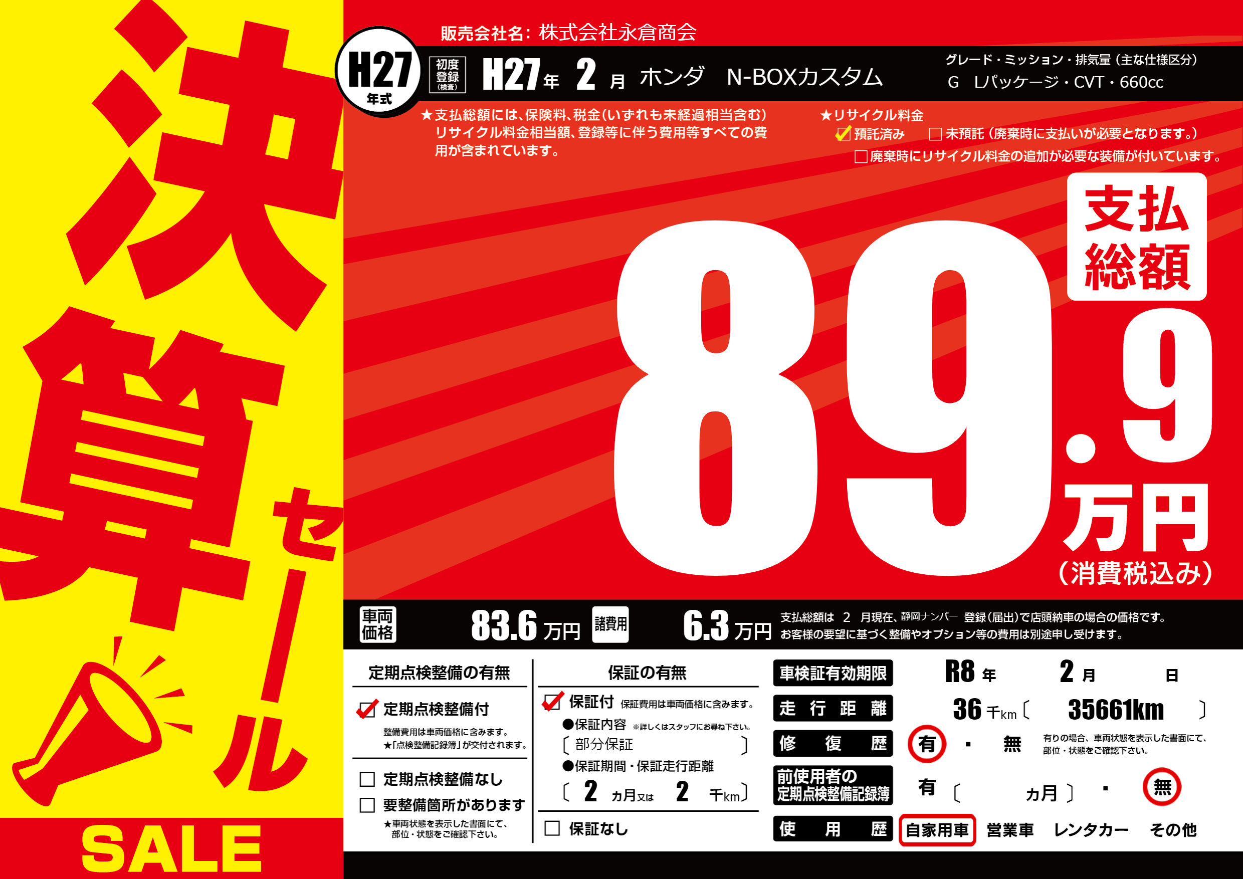 | 車検制限 | R8年 2月 - 日 | ||