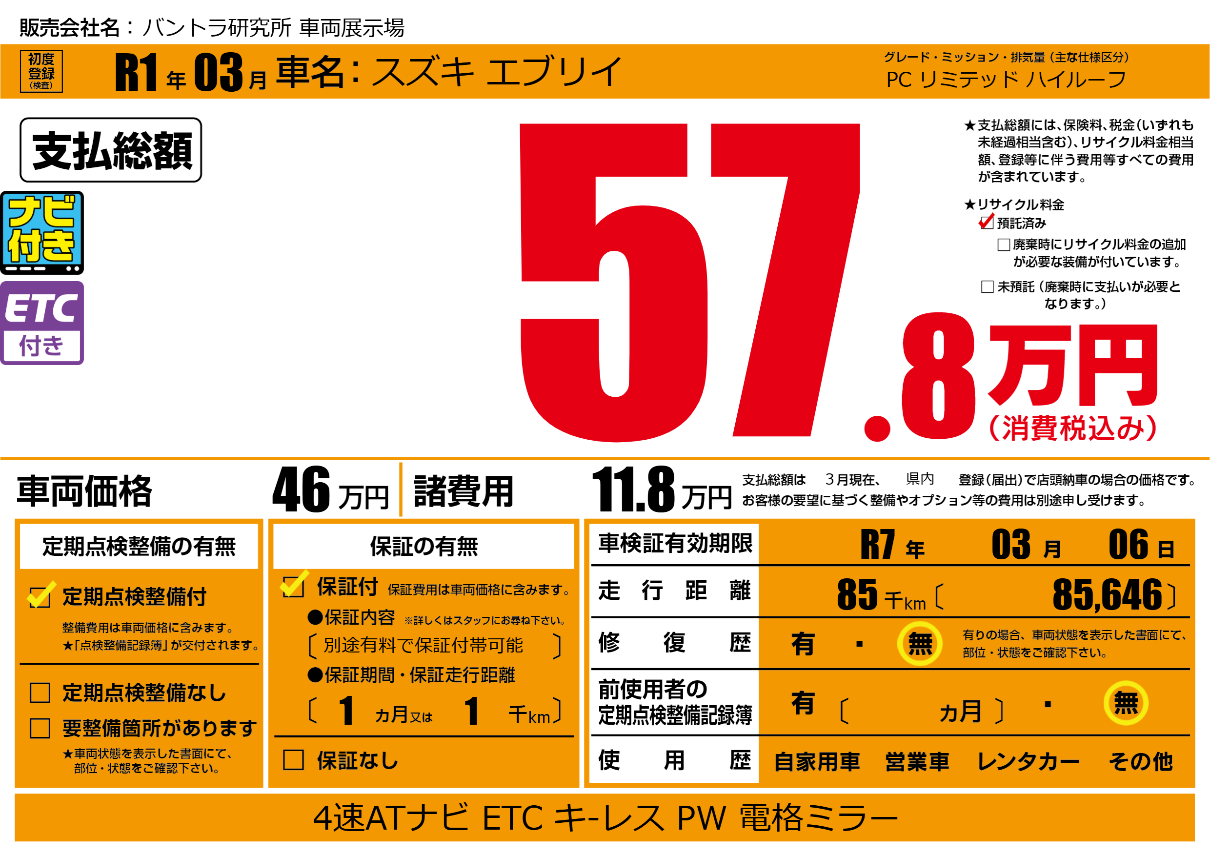 | 車名 | スズキ エブリイ | グレード ミッション 排気量 |