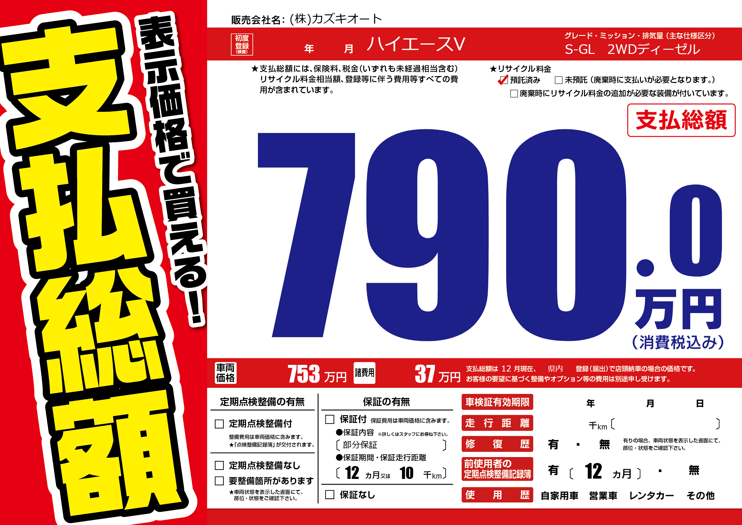 | 車名 | ハイエースV | グレード ミッション 排気量 |