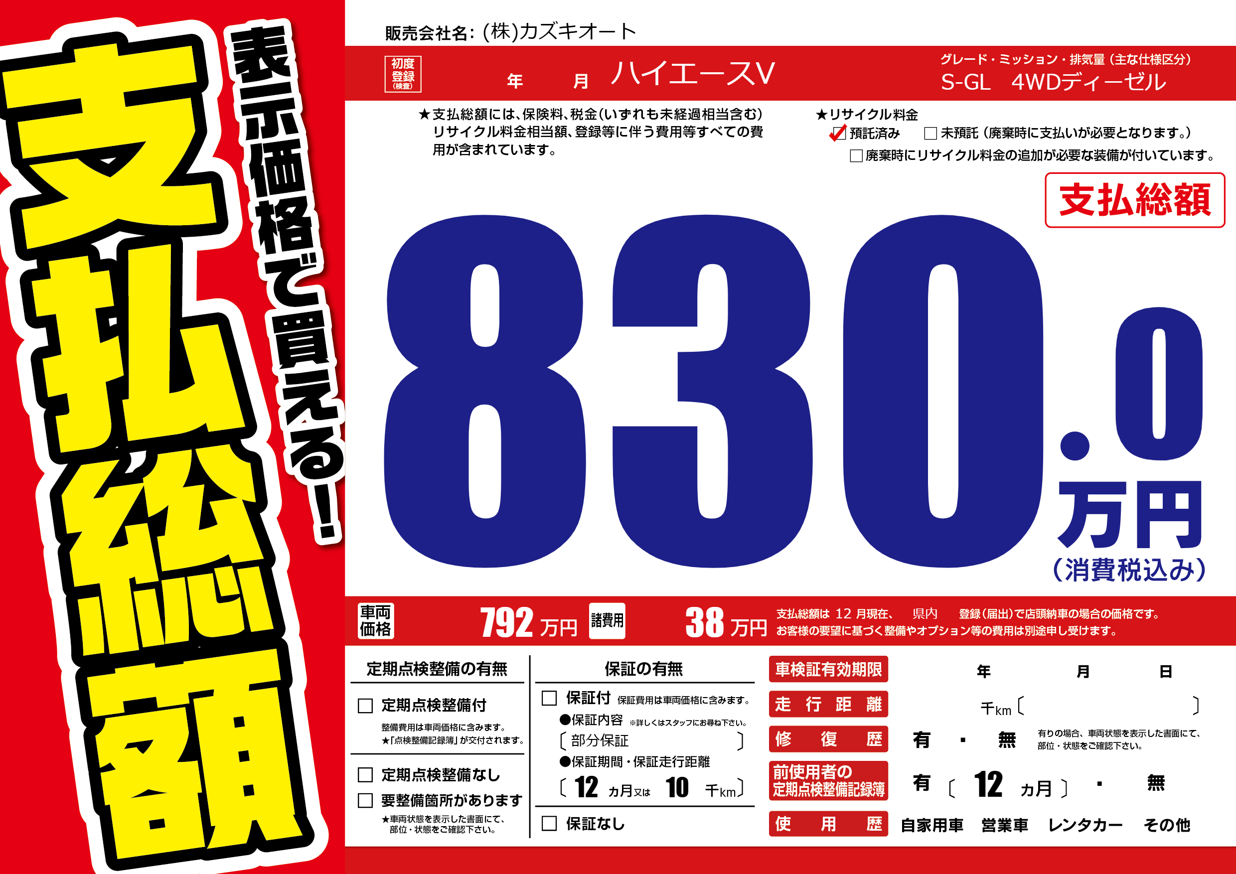 | 車名 | ハイエースV | グレード ミッション 排気量 |